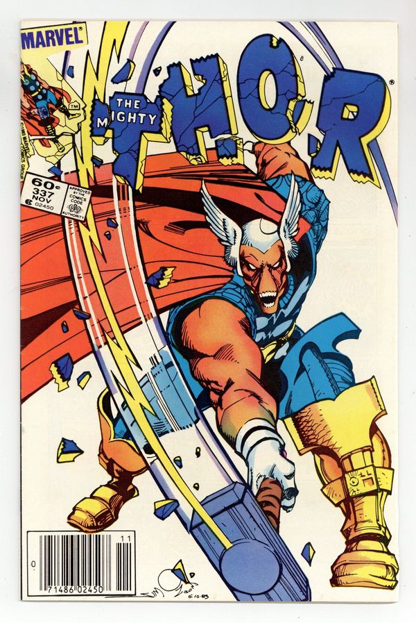 Starts Oct 3 Direct Edition. Cover by Walt Simonson. "Something Old, Something New," script and art by Walt Simonson; Odin has the dwarves create a hammer for Bill and sends the alien and his son into space to rescue Bill's people. Appearances by Sif, Odin, and Volstagg. Bullpen Bulletins. Carlin and Simonson's Page O' Thor Stuff; Assistant editor's month shenanigans. Star Frontiers TSR ad. 36 pgs., full color. $0.60. Cover price $0.60.