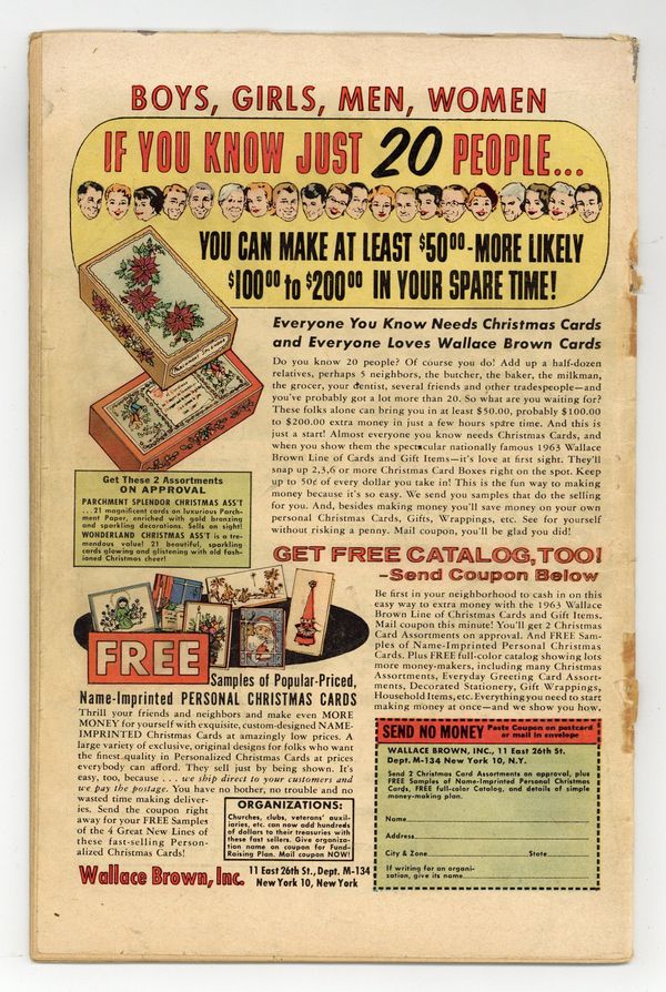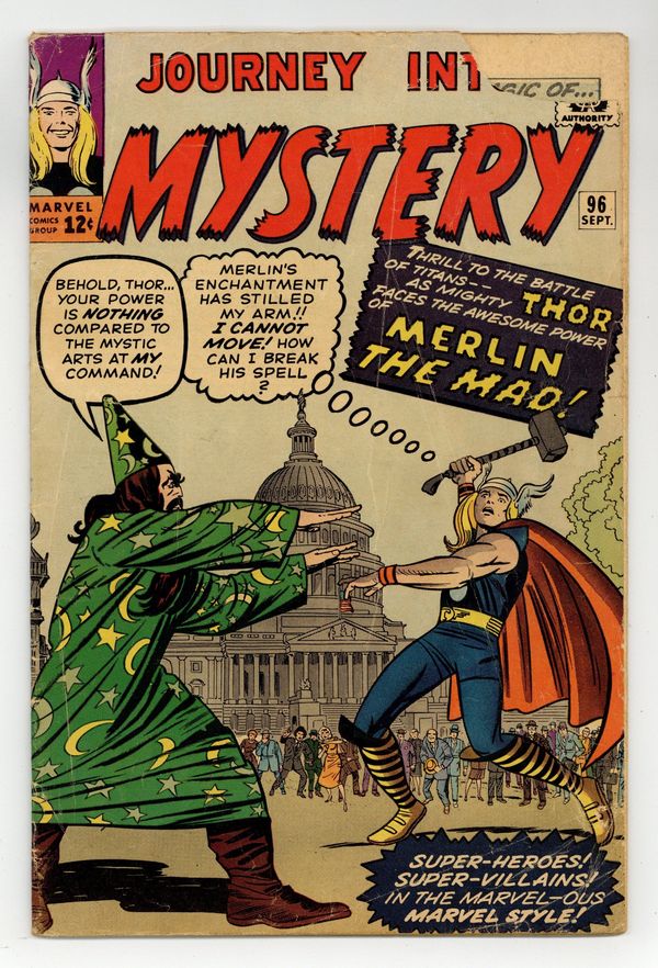Starts Apr 20 Cover pencils by Jack Kirby, inks by Sol Brodsky. "Defying the Magic of... Mad Merlin!", script by Stan Lee (plot) and Robert Bernstein (script), art by Joe Sinnott; Merlin is awakened after a thousand years and immediately decides to try and take over the world; He battles Thor using familiar Washington D.C. monuments; Jane Foster appearance; Cameos by King Arthur and his knights, John F. Kennedy, Pierre Salinger, and Caroline Kennedy. The first half of a two-page text story, "The Traveler." "Call Her...Medusa!":, script by Stan Lee (plot) and Larry Lieber (script), pencils by Larry Lieber, inks by Paul Reinman; The gorgons of myth were aliens and send an agent to modern Earth preceding an invasion. "Frederick Fenton's Future!", script by Stan Lee, art by Steve Ditko; An arrogant rich man builds a time machine in order gain the secret to eternal life from the future. 36 pgs., full color. $0.12. Cover price $0.12.