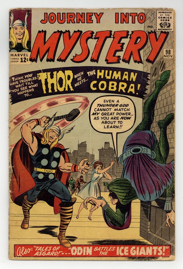 Starts Apr 20 Cover pencils by Jack Kirby, inks by Sol Brodsky. First appearance of the Cobra in "Challenged by the Human Cobra!", script by Stan Lee, art by Don Heck; While visiting India, Don Blake finds that one of his old teachers has been murdered by a villain who gained the power of a snake; Odin and Jane Foster appearances. "Snowstorm" two-page text story. "The Purple Planet," script by Stan Lee (plot) and Larry Lieber (script), pencils by Larry Lieber, inks by Matt Fox; A criminal in the future travels to a rich but primitive world, hoping to exploit the simple people. Second "Tales of Asgard" installment, "Odin Battles Ymir, King of the Ice Giants," script by Stan Lee, pencils by Jack Kirby, inks by Don Heck; The ice giants, led by Ymir, attack Asgard but Odin defends it and traps Ymir inside a ring of fire. 36 pgs., full color. $0.12. Cover price $0.12.