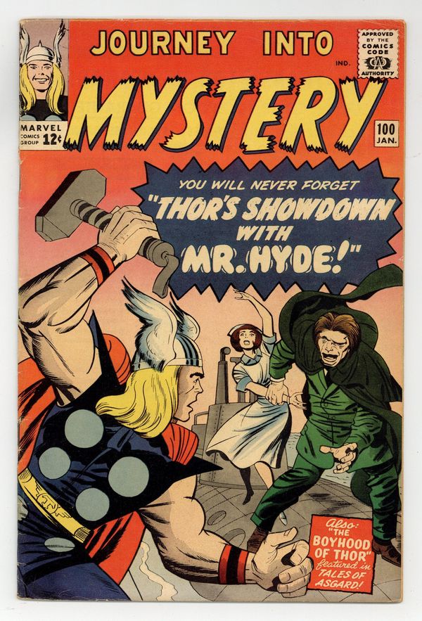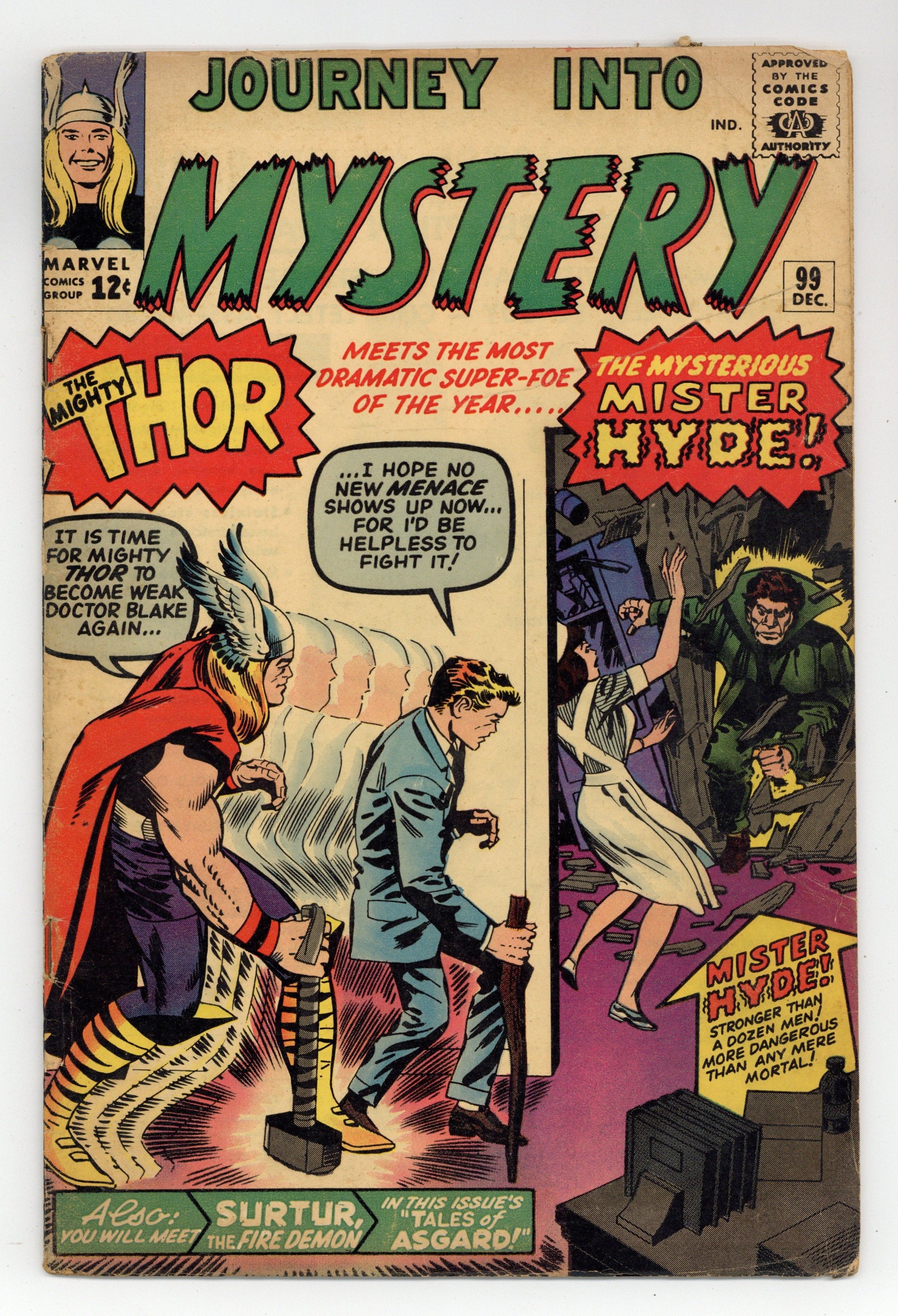 Starts Mar 23 Cover pencils by Jack Kirby, inks by George Roussos. First appearance of Mr. Hyde in "The Mysterious Mister Hyde!", script by Stan Lee, art by Don Heck; Having been refused a job by Doctor Blake, Calvin Zabo becomes Mister Hyde and attacks the doctor; Meanwhile, Odin has agreed to let Thor marry Jane Foster if she proves worthy. "The Thread" text story. "Stroom's Strange Solution!", script by Stan Lee (plot) and Larry Lieber (script), pencils by Larry Lieber, inks by Matt Fox; An alien world is dangerously overpopulated, so a scientist releases a gas that shrinks the entire population, making the same amount of space accommodate more people. Third "Tales of Asgard" installment, "Surtur the Fire Demon!, script by Stan Lee, pencils by Jack Kirby, inks by George Roussos; The Trolls ally with Surtur against Asgard, but Odin conquers them; Surtur travels to Earth to destroy it. 36 pgs., full color. $0.12. Cover price $0.12.