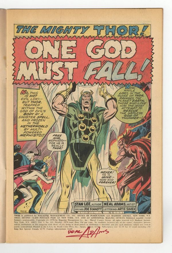 Starts Mar 23 Cover pencils by John Buscema and Marie Severin (layout, alterations). "One God Must Fall!", script by Stan Lee, pencils by Neal Adams, inks by Joe Sinnott; Trapped in Loki's body, Thor has been banished to Hades and made prisoner of Mephisto, sending Sif and the Warriors Three to his rescue; They attempt to save Thor, however Mephisto's magical powers and legions of demonic creatures prove too much for them; Taking advantage of the fact that he has access to Loki's magical might, Thor focuses this power to free himself from the block of ice that Mephisto had frozen him into; Thor then challenges Mephisto, who boasts that Loki is on Earth ruining his good name; Thor battles Loki, hoping that his half-brother can be separated from the mystic hammer in his hands; When the opportunity presents itself, Thor charges at Loki and lets him pummel him; As Thor had hoped, when the 60 second time limit that Thor's body can be separated from his hammer had come to pass, Loki's body reverts back into the form of Donald Blake which then causes the body-switch to reverse itself restoring Thor back to his own body. 36 pgs., full color. $0.15. Cover price $0.15.