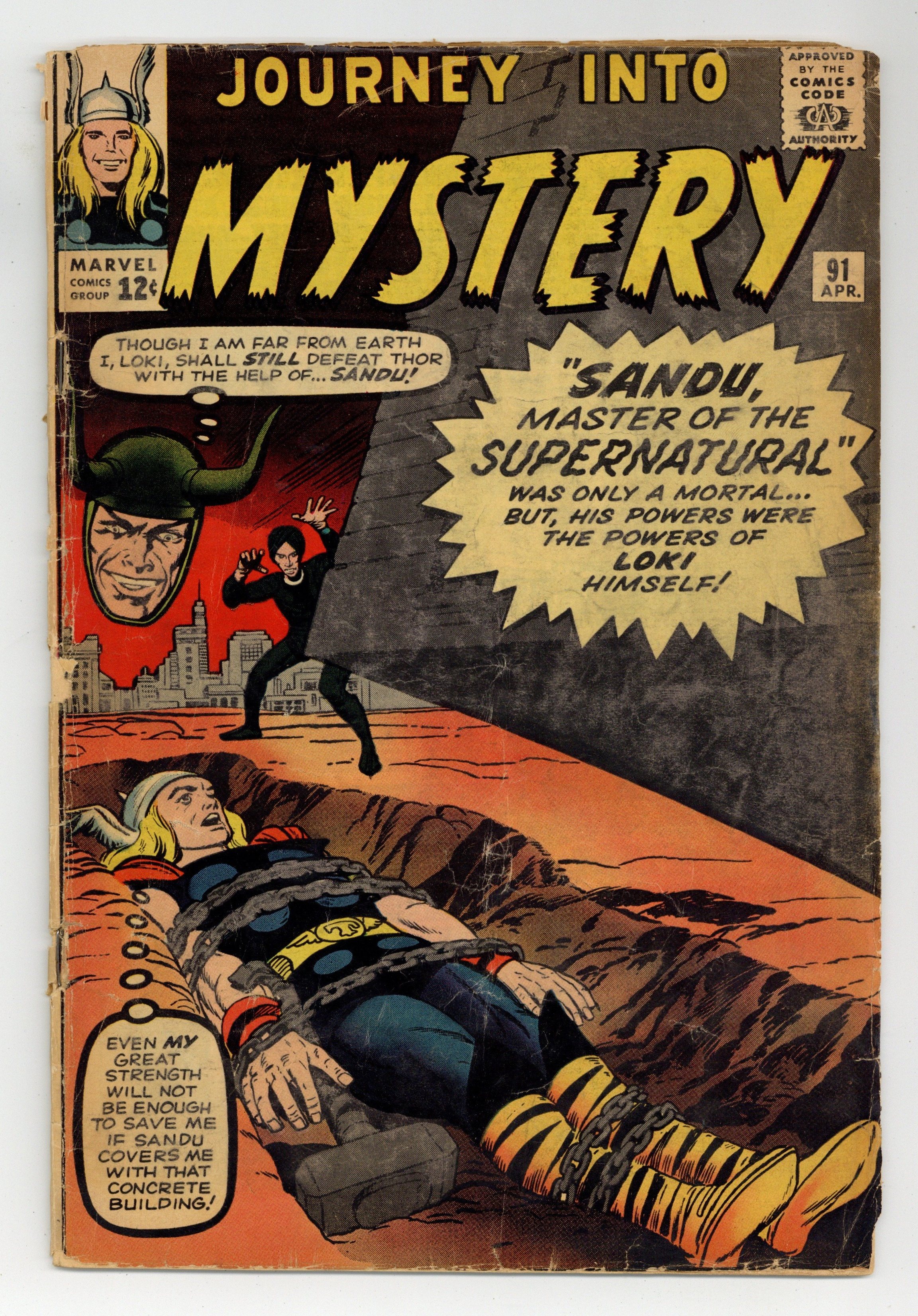 Starts Apr 20 Cover pencils by Jack Kirby, inks by Dick Ayers. "Sandu, Master of the Supernatural!", script by Stan Lee (plot) and Larry Lieber (script), art by Joe Sinnott; Loki gives a greedy carnival mystic magical powers in order to use him to attack Thor; Thor is overcome in their first battle, but with the help of Odin and his belt of strength he defeats Loki's pawn; Jane Foster appearance; first appearance of Odin's Valkyries (cameo). "The Party" text story. "The Seedlings," script by Stan Lee (plot) and Larry Lieber (script), pencils by Larry Lieber, inks by Sol Brodsky; Alien spores land on Earth and bloom into telepathic plants that would have conquered the world had they not been eaten by crows. "The Manikins!", script by Stan Lee, art by Steve Ditko; An odd man works with the manikins in a department store, but becomes upset when one of the female manikins is to be put in a bridal display; The employee disappears and the groom is replaced with a manikin that looks just like him. 36 pgs., full color. Cover price $0.12.
