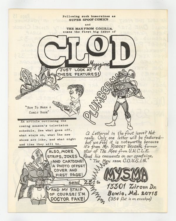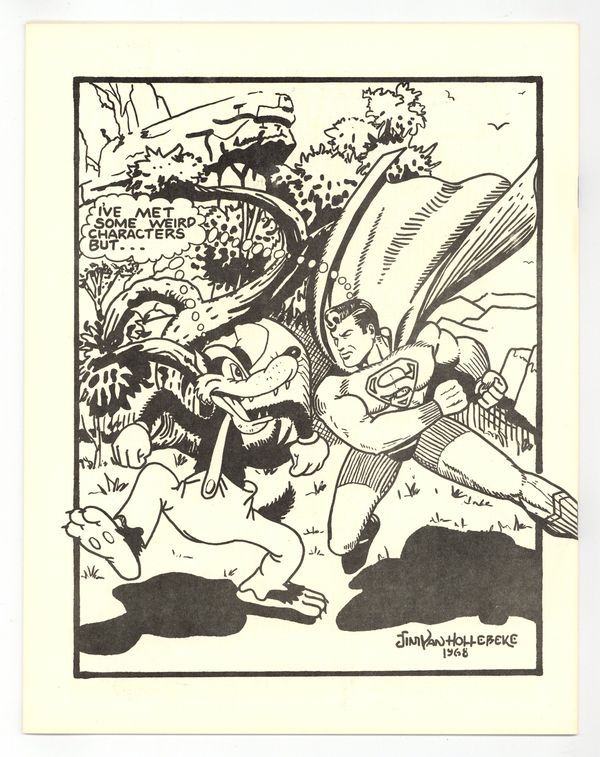 Starts Apr 20 Cover by Buddy Saunders, owner of Mycomicshop and Lone Star Comics. Buddy's cover stars the Timely Golden Age superhero The Vision. Published by Chuck Wooley in 1968. Larry Herndon's "Fandom's Library" continues, as does "A Listing Of Whitman Material" by Dale Manesis. Dale's installment is a very detailed alphabetical list of the Whitman BLBs, from Dick Tracy 1454 to Little Orphan Annie 1403. There are a lot of other features, including a list of current fanzines, a Panelology Quiz, a Krazy Kat article, and Justice Society portraits by Bill Wilson. For many, the highlight is three pages of photos from the 1968 Dallas SW convention. Pictured are Ken Finnerty, Larry and Irving Bigman, Chuck Wooley, Fritz Leiber, Larry Herndon, Tom Reamy, Gary Acord, Caz, Boyd and Dee, Paul McSpadden, Bill Wallace, and G. B. Love. "For Sale" ad highlights find Buddy Saunders offering Avengers 1 for $3.25, Spider-Man 13 for $1.25, Marvel Super Heroes 13 for 50c, and X-Men 4 at $1. The back cover is a humorous full page pin-up of Superman meeting the Big Bad Wolf, by Hollebeke. 8.5-in. x 11-in. 28 pages B&W. Cover price $0.50. Cover price $0.50.