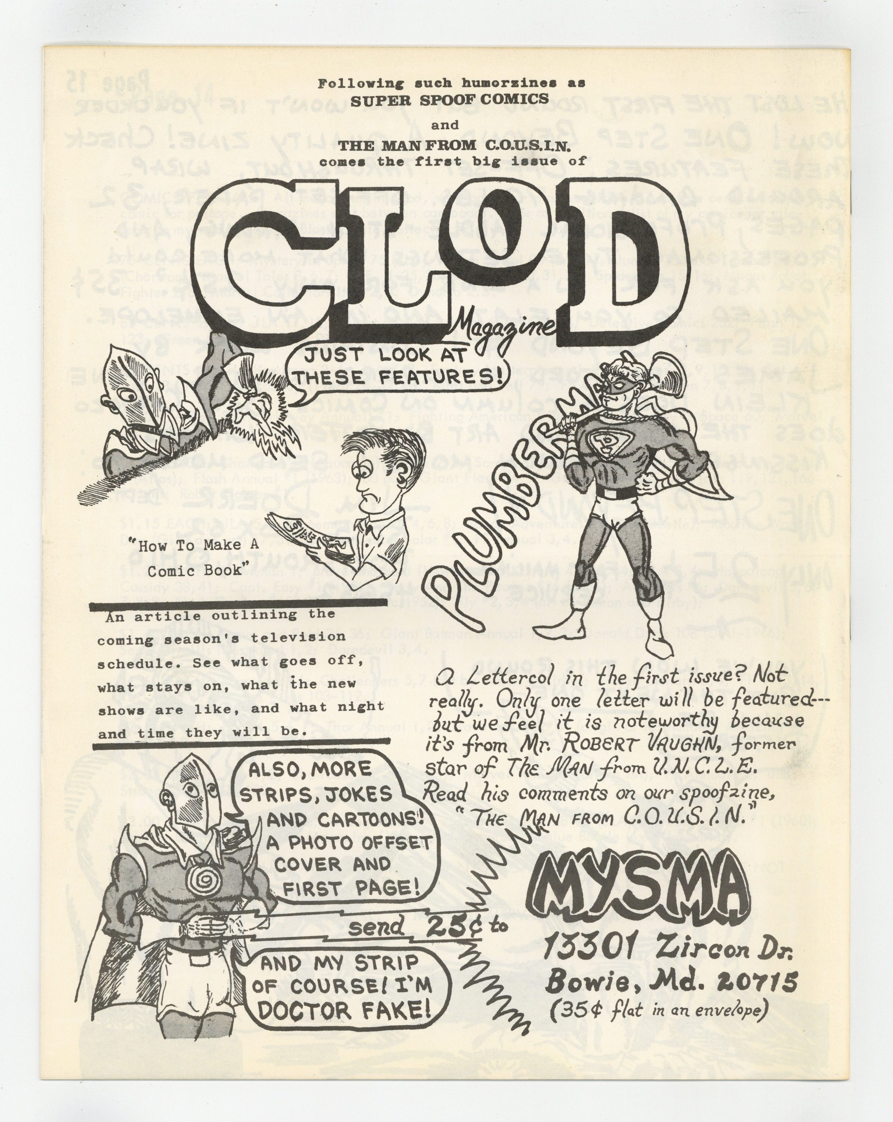 Starts May 11 Cover by Buddy Saunders, owner of Mycomicshop and Lone Star Comics. Buddy's cover stars the Timely Golden Age superhero The Vision. Published by Chuck Wooley in 1968. Larry Herndon's "Fandom's Library" continues, as does "A Listing Of Whitman Material" by Dale Manesis. Dale's installment is a very detailed alphabetical list of the Whitman BLBs, from Dick Tracy 1454 to Little Orphan Annie 1403. There are a lot of other features, including a list of current fanzines, a Panelology Quiz, a Krazy Kat article, and Justice Society portraits by Bill Wilson. For many, the highlight is three pages of photos from the 1968 Dallas SW convention. Pictured are Ken Finnerty, Larry and Irving Bigman, Chuck Wooley, Fritz Leiber, Larry Herndon, Tom Reamy, Gary Acord, Caz, Boyd and Dee, Paul McSpadden, Bill Wallace, and G. B. Love. "For Sale" ad highlights find Buddy Saunders offering Avengers 1 for $3.25, Spider-Man 13 for $1.25, Marvel Super Heroes 13 for 50c, and X-Men 4 at $1. The back cover is a humorous full page pin-up of Superman meeting the Big Bad Wolf, by Hollebeke. 8.5-in. x 11-in. 28 pages B&W. Cover price $0.50. Cover price $0.50.