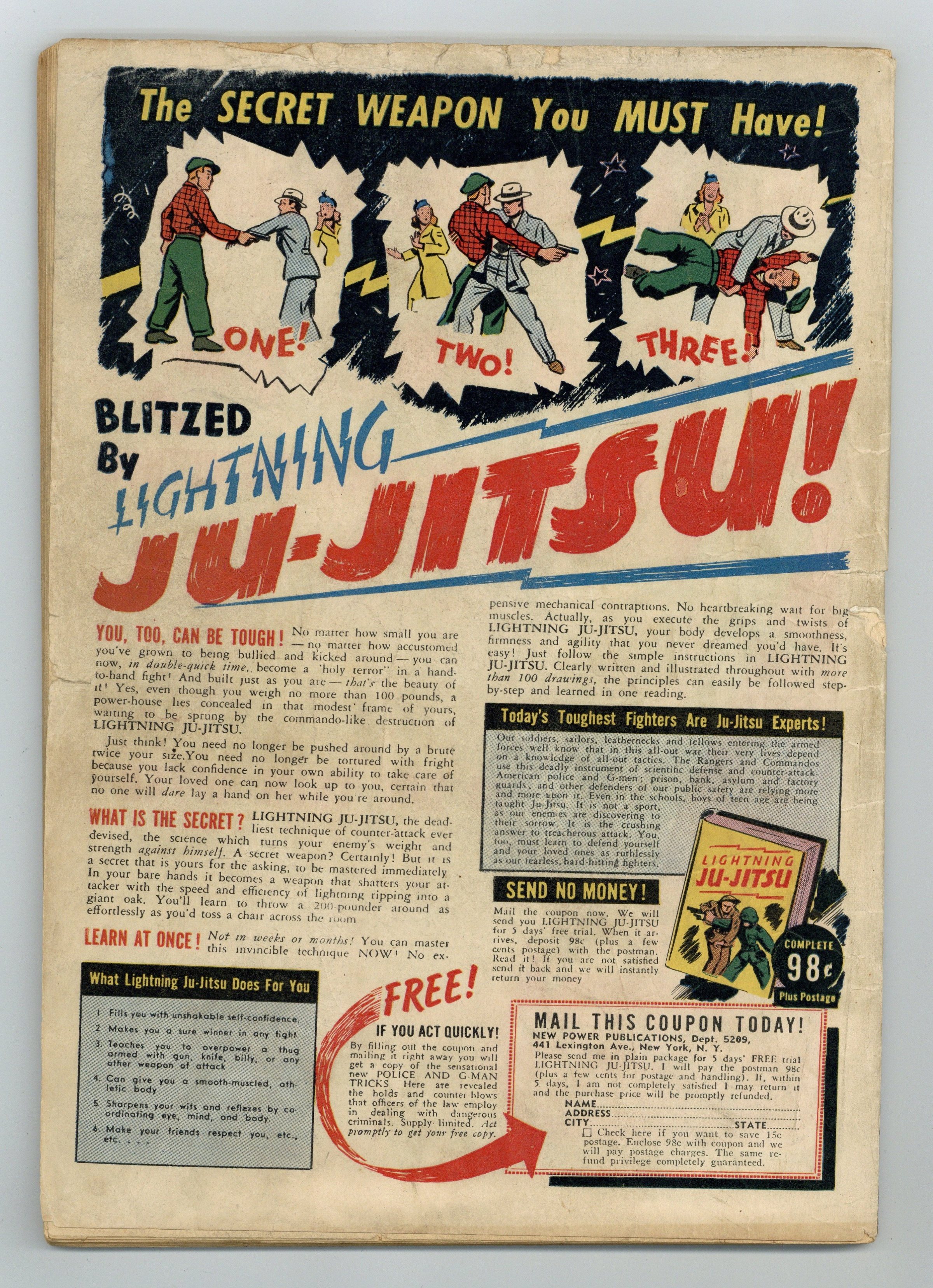 Starts Jul 4 Cover pencils by Ruben Moreira. Barry the Magician, pencils by Sheldon Moldoff. Exhibit "A"; During the course of the case Foster was working on, Doc Vaughn discloses to Ah Choo Foster's true identity as the Great Defender. Making Things Hot For the Japs starring Her Highness. Murder In Hollywood starring Betty Bates, art by Al Bryant. Dan Tootin humor page by Jack Cole. Back In the U.S.A. starring Bob and Swab, script and art by Klaus Nordling. Daniel Goon For Sheriff starring Woopy. In the Clutches of Prof. Twerp, art by Paul Gustavson; Bill is kidnapped by the pint-sized scientist Professor Twerp, who attempts to discover Bill's powers. 68 pgs. $0.10. Cover price $0.10.