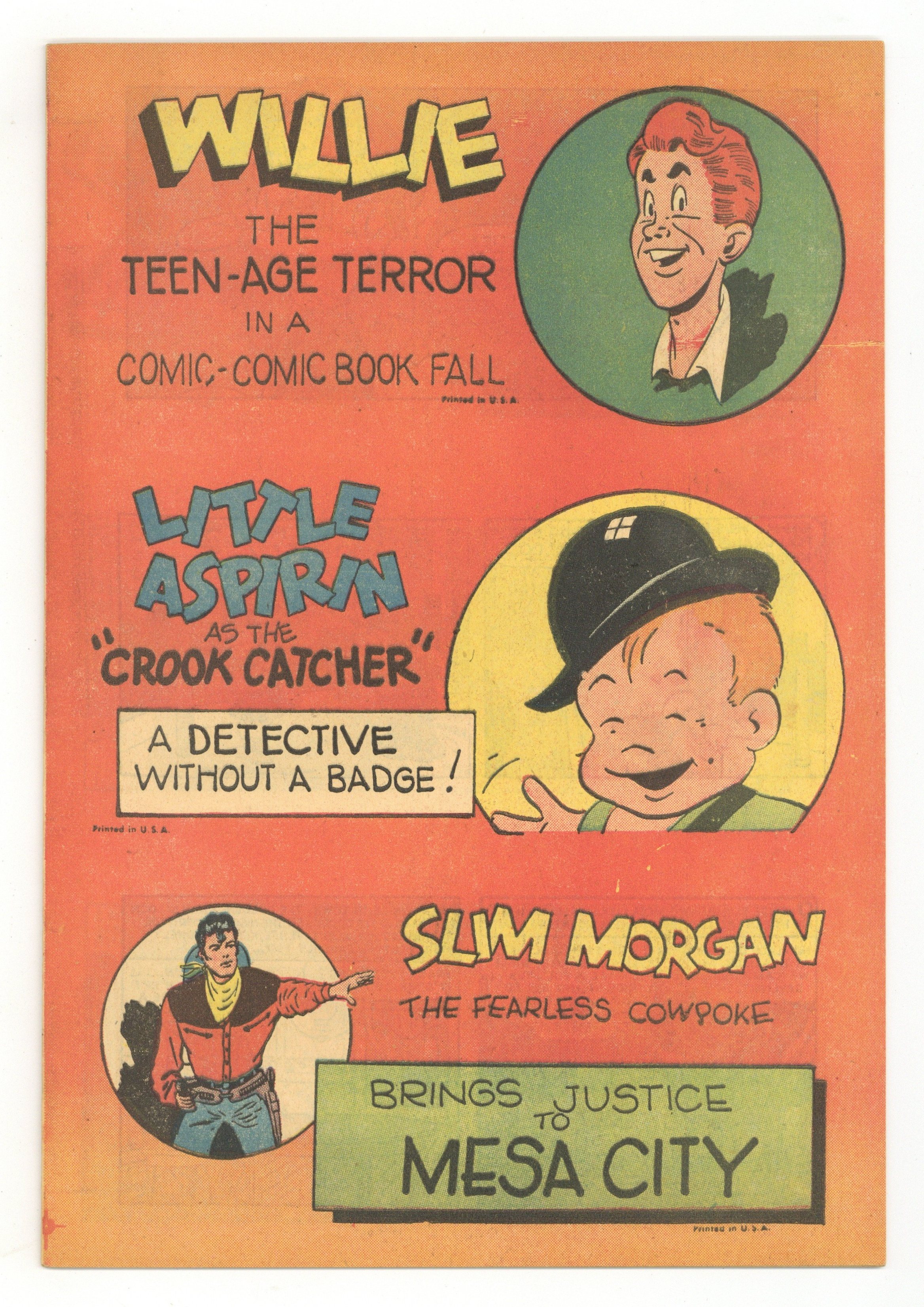 Starts Apr 4 Wisco-Klarer giveaways that were uncut and undistributed. Includes Willie The Teen-Age Terror, Little Aspirin as the "Crook Cathers", and Slim Morgan Brings Justice to Mesa City. 24 pages, full color.