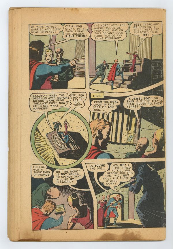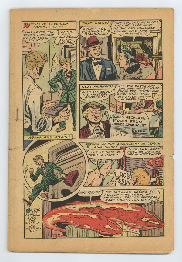 Ends Apr 13 8:38 PM CST Bid History 24 bids Current Bid $2,855 Your Secret Max Bid If you'd like to bid, please log in or register. Cover art by Alex Schomburg. The Phantom Strikes starring Human Torch, art by Harry Sahle. The Niagra Falls Power Plot starring Sub-Mariner, art by Carl Pfeufer. The Circus Mystery starring Terry Vance, art by Bob Oksner. The Right Kind of Stuff text story. The Land of the Rubber People starring Jimmy Jupiter, script and art by Ed Robbins. The Gem That Blinded starring Vision, pencils by Syd Shores. Patriot untitled story, pencils by Syd Shores. The Case of the Laughing Death starring Angel, art by Gustav Schrotter. 68 pages. Cover price $0.10.