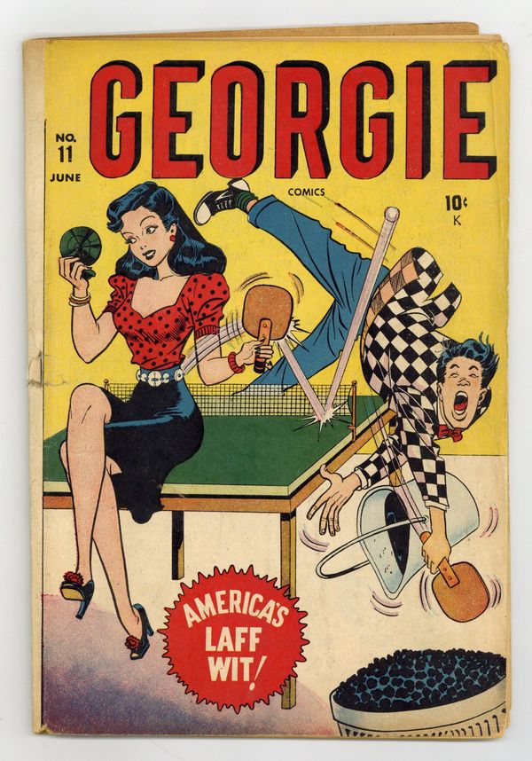 Starts May 4 Cover by Mike Sekowsky. Stories by Ken Bald and unknown. Art by Mike Sekowsky, Ken Bald and Morris Weiss America's laff-wit Georgie stars in four stories with art by Mike Sekowsky: "Ain't Love Lovely?"; "Judy's Tennis Menace!"; "The Bear Facts of Life!"; and "The Romantic Romeo!" Also in this issue: Margie in "Margie's Movie Mix-Up!" with art by Morris Weiss; 2-page text story "Uncle Tom's Present"; and Millie the Model in "Publicity Mad!" by Ken Bald. 48 pages, full color. Cover price $0.10.