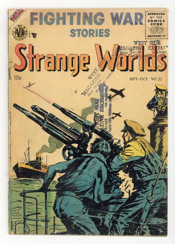 Starts May 4 Art by Louis Ravielli, Vince Alascia, Mel Keefer, and Gene Fawcette. Cover by Everett Raymond Kinstler. Strange Worlds, formerly a science fiction title, continues in the Comics Code era as a war comic, reprinting stories from US Marines in Action (1952) #2. A Marine task force undertakes an impossible mission to the Korean shore; A mismatched duo finds unexpected danger on a mission behind enemy lines; A reckless pilot endangers his unit to win a contest with his brother, also a hotshot pilot. Also featuring another fine cover by Everett Raymond Kinstler. Operation Boomerang; Candidate For A Firing Squad; The Picture of Doom; Glory Sky-Ace; Death Trap; Submarine Fighters. Final issue of the series. 32 pages, Full Color. Cover price $0.10.