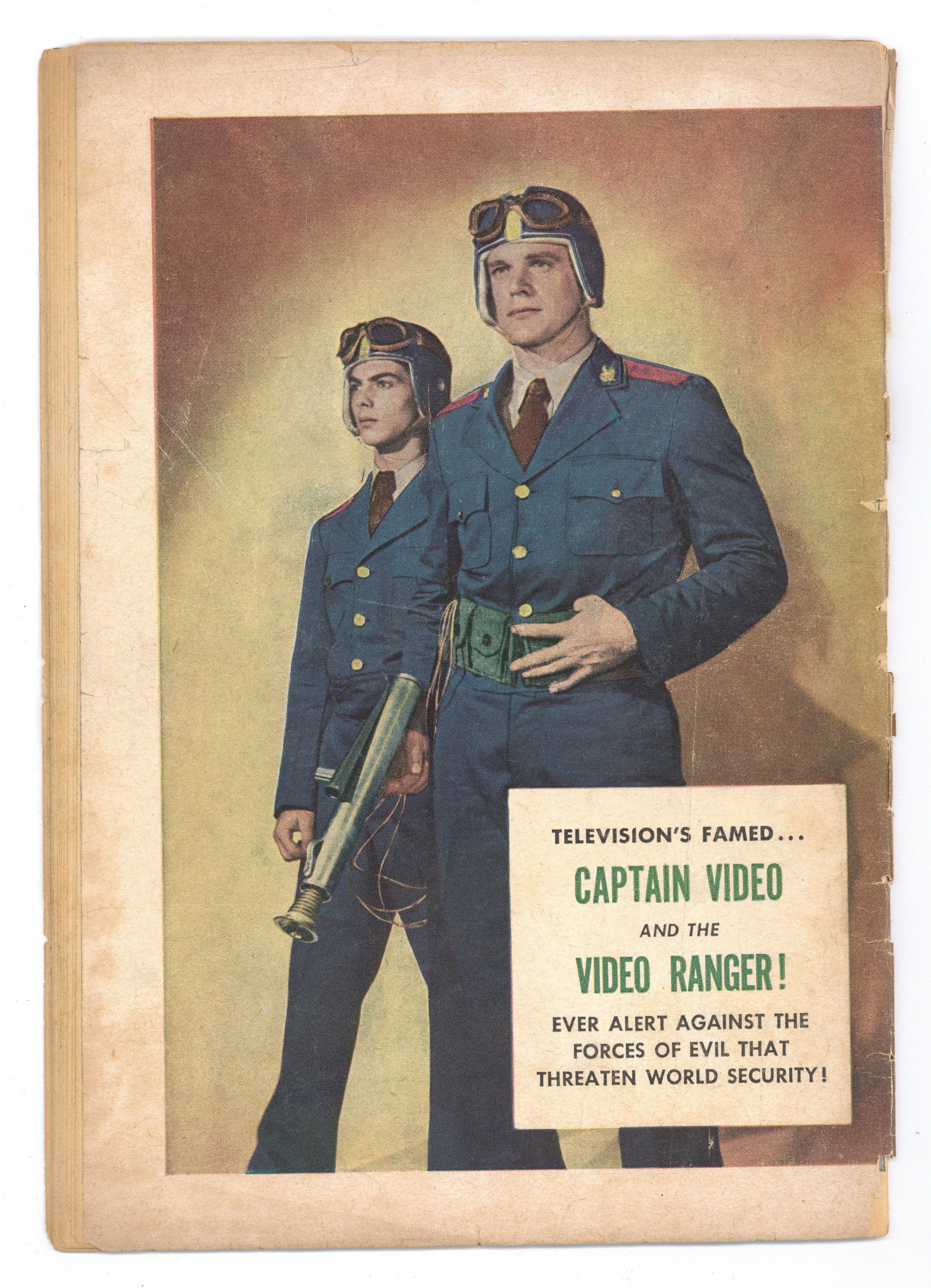 Starts Feb 2 Stories and art by George Evans and Martin Thall. Early TV superhero Captain Video comes to comics, an electronics wizard from an era when technology was just starting to change the world. Cap and Ranger investigate after their pal Professor Bradley disappears, and the mysterious Dr. Hypnox shows up with a gun looking for him. Western-movie hero Rod Cameron gets a mite unfriendly when owlhoots steal his horse War Paint and try to pass him off as someone else's horse. Cap and Ranger take action after their "opticon scillometer" shows them a man being chased by a monster scorpion. Art by future EC legend George Evans. Plus photos of TV's Captain Video and Ranger, Al Hodge and Don Hastings, including a color photo on the back cover. And moral lessons from Captain Video. The Secret of Sun City; Dizzy Daisy; Rod Cameron: Bushwhacker Bait; Captain Cromwell of the Space Patrol; The Creatures of Doom; Doc Sorebones. 32 pages, Full Color. Cover price $0.10.