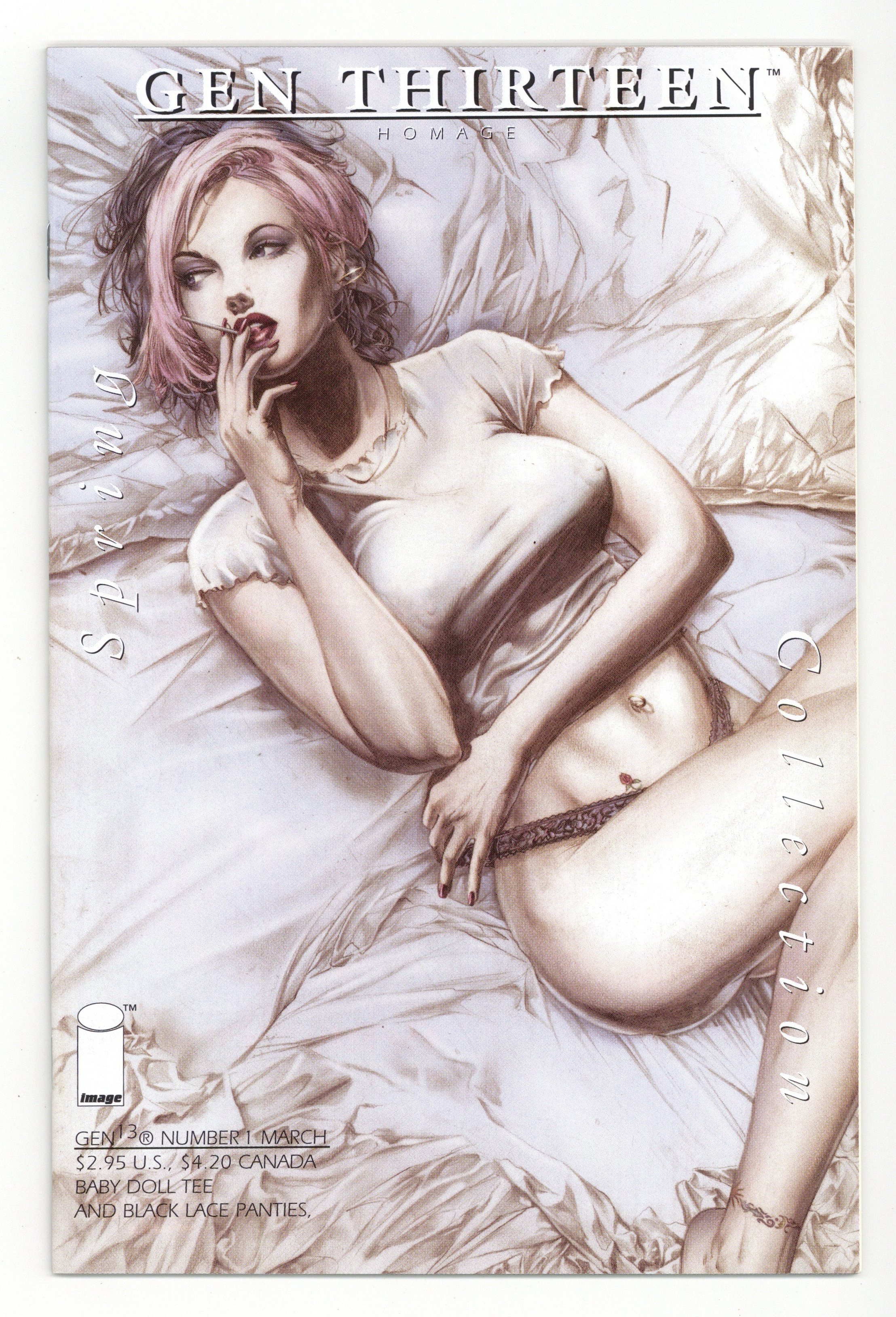 Direct Edition. Cover pencils by J. Scott Campbell, inks by Alex Garner. Untitled story, script by Jim Lee and Brandon Choi, pencils by J. Scott Campbell, inks by Alex Garner and Sandra Hope (assistant); Fairchild is brought into the Gen 13 program, introduced to her fellow gen actives and develops powers. Centerfold Poster, pencils by Jim Lee, inks by Alex Garner. Gen 13 Sketchbook, art by J. Scott Campbell and Jim Lee; Design sketches for the Gen 13 characters. 42 pgs., full color. $2.50. Cover price $2.50.