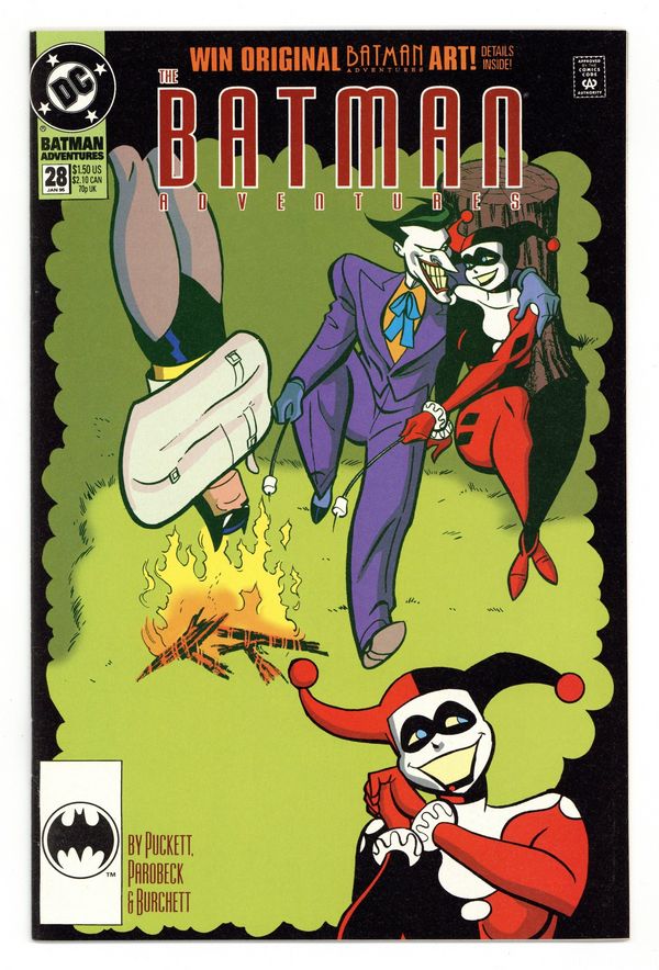 Direct Edition. 1st appearance of Harley Quinn in a comic book. "Batgirl: Day One." Barbara Gordon attends a costume party dressed as Batgirl. Unfortunately, Poison Ivy and Harley Quinn also decide to show up. Based on Batman The Animated Series. Script by Kelley Puckett, pencils by Mike Parobeck, inks by Rick Burchett. Cover by Parobeck. Cover price $1.25.