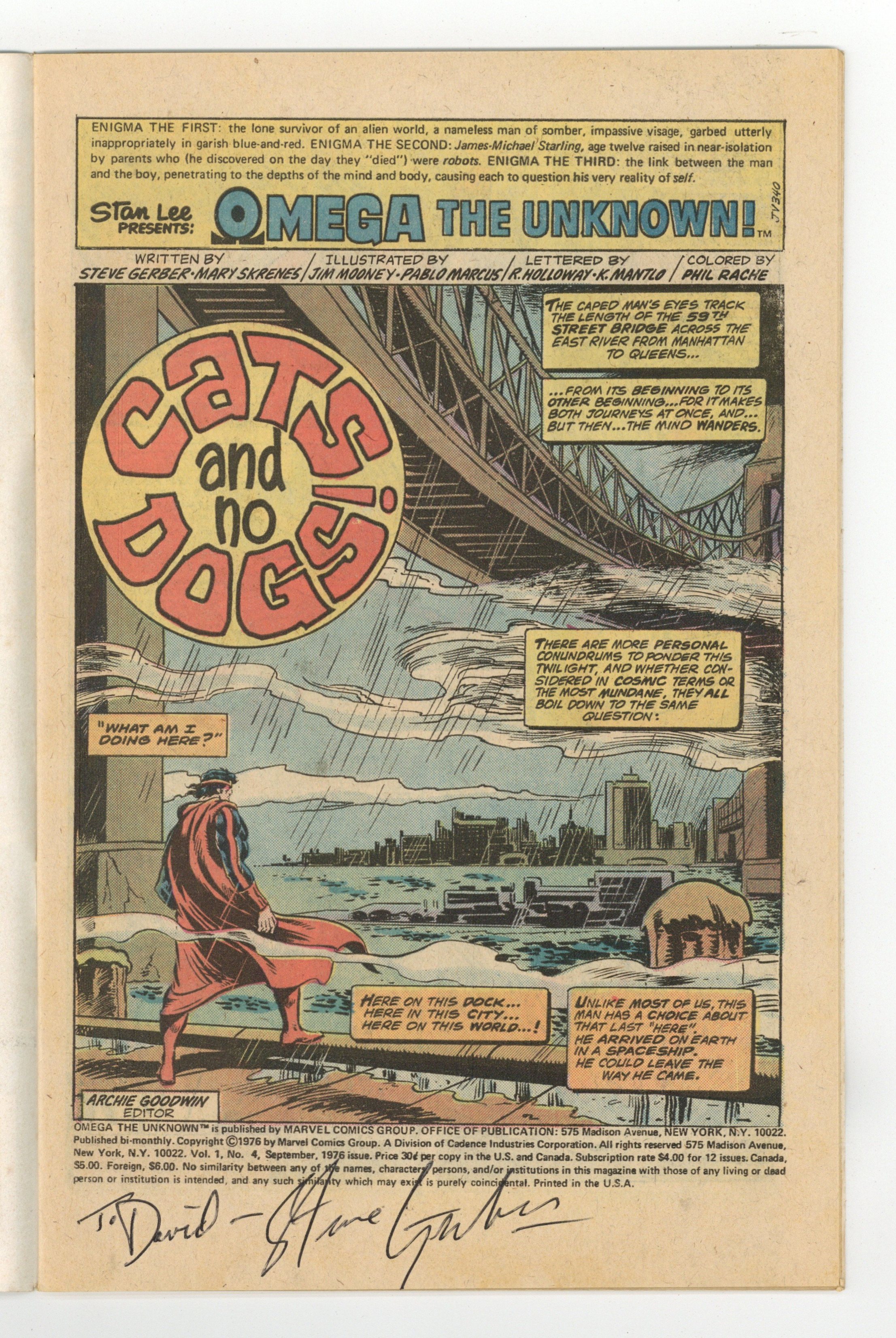 Starts Apr 27 Cover by Ed Hannigan and Frank Giacoia. Cats and No Dogs!, script by Mary Skrenes and Steve Gerber, art by Jim Mooney and Pablo Marcos; Omega rescues Teresa once and with Gramps help he holds El Gato to a draw, while James-Michael and his new friends have problems in school with Nick. 36 pgs., full color. $0.30. Cover price $0.30.