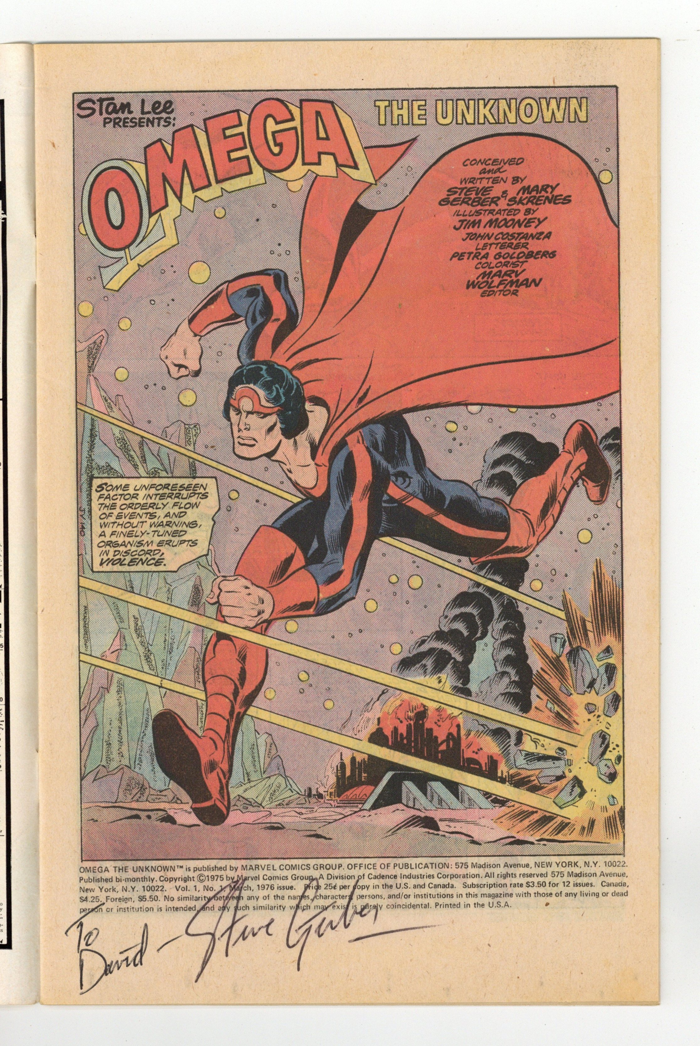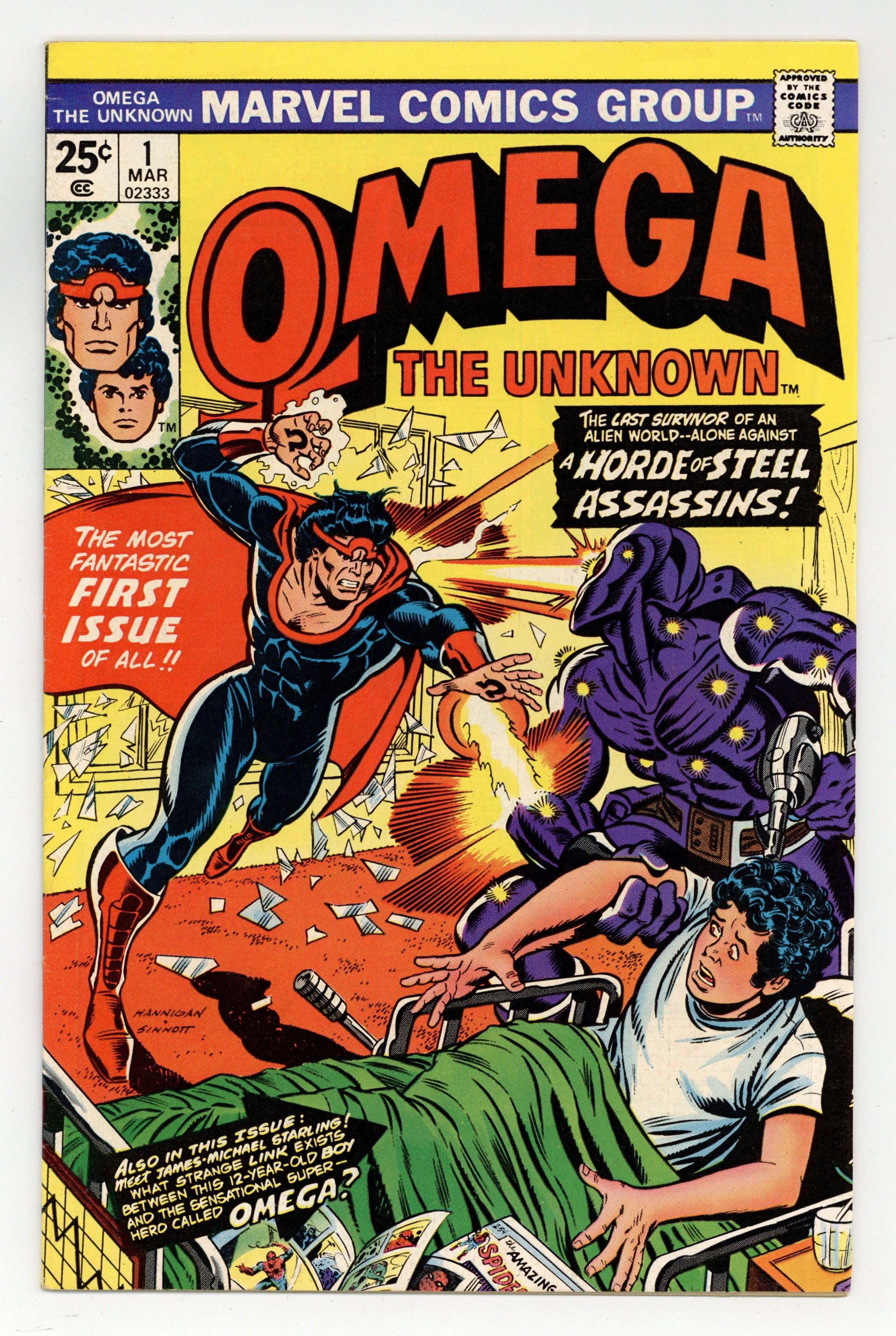 Starts May 4 With Marvel Value Stamp. Cover by Ed Hannigan and Joe Sinnott. Omega the Unknown, script by Mary Skrenes and Steve Gerber, art by Jim Mooney; Omega the Unknown, the last survivor of an alien world, battles a horde of steel assassins; a 12-year-old boy has a mysterious link with Omega. Marvel Value Stamp. 36 pgs., full color. $0.25. Cover price $0.25.