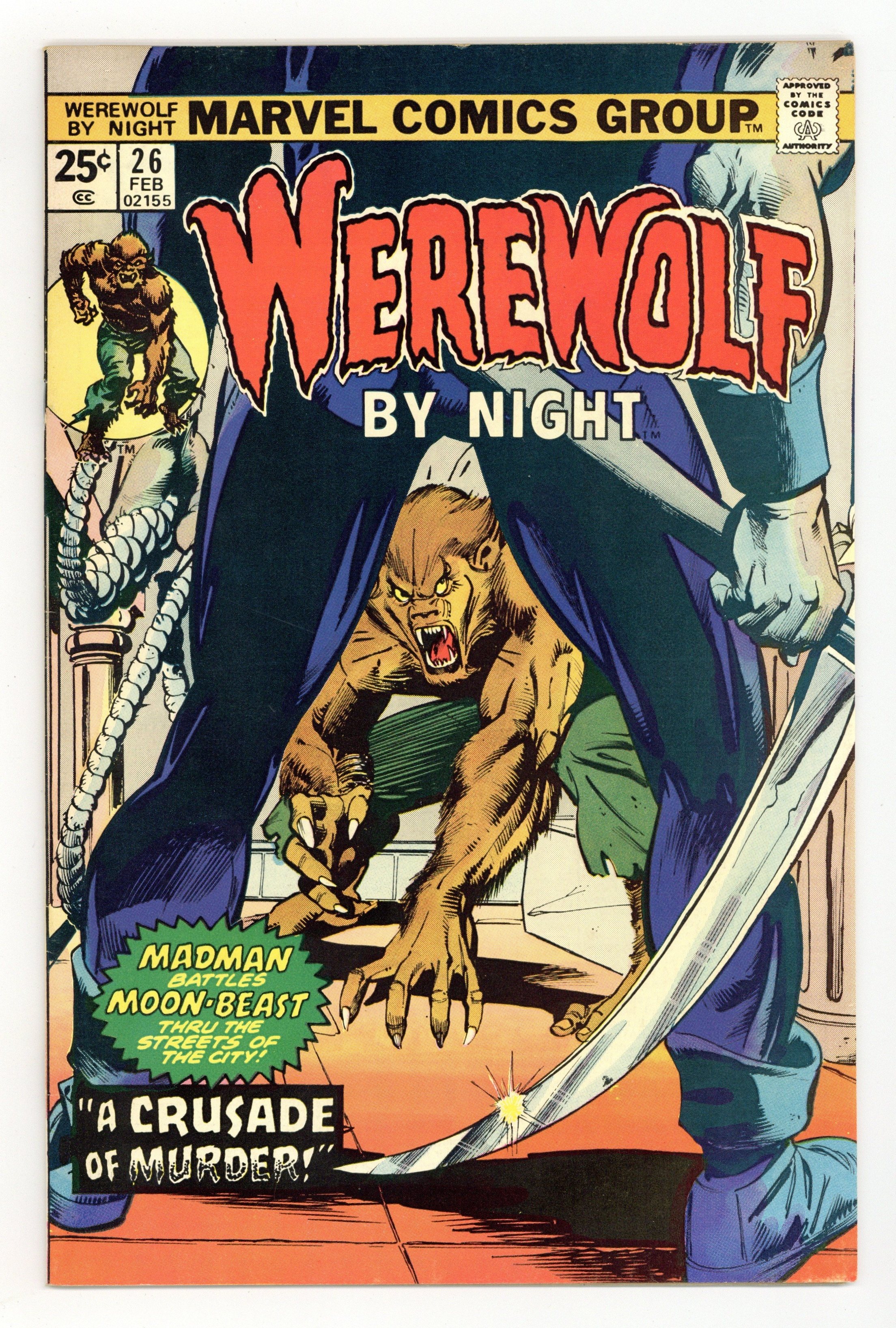 Starts Feb 2 Marvel Value Stamp. Cover pencils by Gil Kane, inks by Klaus Janson. A Crusade of Murder, script by Doug Moench, art by Don Perlin; the Werewolf gets into a skirmish with the Hangman and DePrayve. Cover price $0.25.