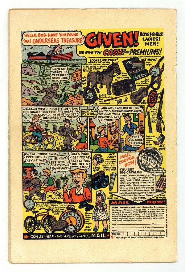 Starts Jan 26 Cover art by Bill Everett. Menace of the Humanoids, art by Don Heck; An engineer building the first satellite finds himself attacked by thugs in humanoid costumes. King of the Glacier Men, pencils by Al Williamson, inks by Ralph Mayo; A European dictator is exiled to the North where he becomes king of the glacier men. The Men in the Mole!, art by John Forte; Three men in a mole-like drilling device find a world underground populated by sorcerers. The Ghost Wore Armor, pencils by Bob Forgione, inks by Jack Abel; An explorer looks to steal golden armor from the natives. Lost in Time text story. Shangri-La, art by Bill Everett; A man makes it back from Shangri-La only to be informed that the man he spoke with, whom he takes to be mad, actually left for the valley four hundred years ago. The Puppets of Pierre Garou, art by Reed Crandall; A puppeteer shrinks people who try to rob him and uses them in his show. 36 pgs. $0.10. Cover price $0.10.