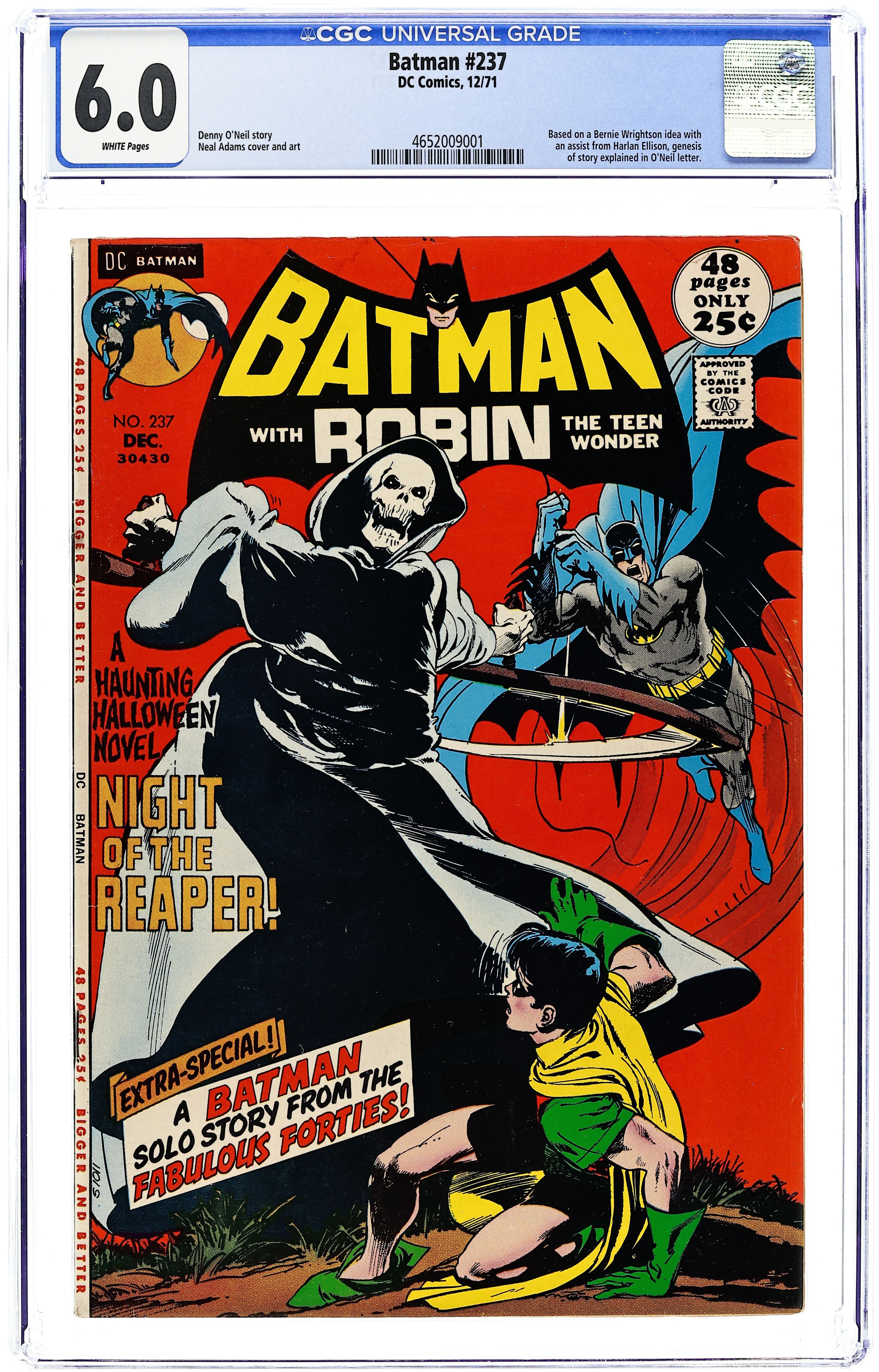 Starts Feb 9 Cover by Neal Adams. "Night of the Reaper!", script by Denny O'Neil, pencils by Neal Adams inks by Dick Giordano; Dick Grayson attends the annual Vermont parade on Halloween with some of his college friends; The notice some crooks attacking a man dressed as Robin and try to help him; The Reaper attacks Robin; Batman, who has been tracking an ex-Nazi war criminal to the parade, finds Robin and takes him to the house of Tom Fagan, the parade organizer. A letter from Denny O'Neil who recounts the real life events that inspired "Night of the Reaper." "The Screaming House," script by Bill Finger, pencils by Bob Kane and Jerry Robinson (backgrounds), inks by Bob Kane; While passing by an old house, the Batman hears screams and rushes in to save a man, who he soon discovers is a crook that has been double crossing his boss and who kills the thugs torturing him so there will be no witnesses; Later, the Caped Crusader learns from the dying Joey that his boss is a big time smuggler. 52 Pages, Full Color. Cover price $0.25.