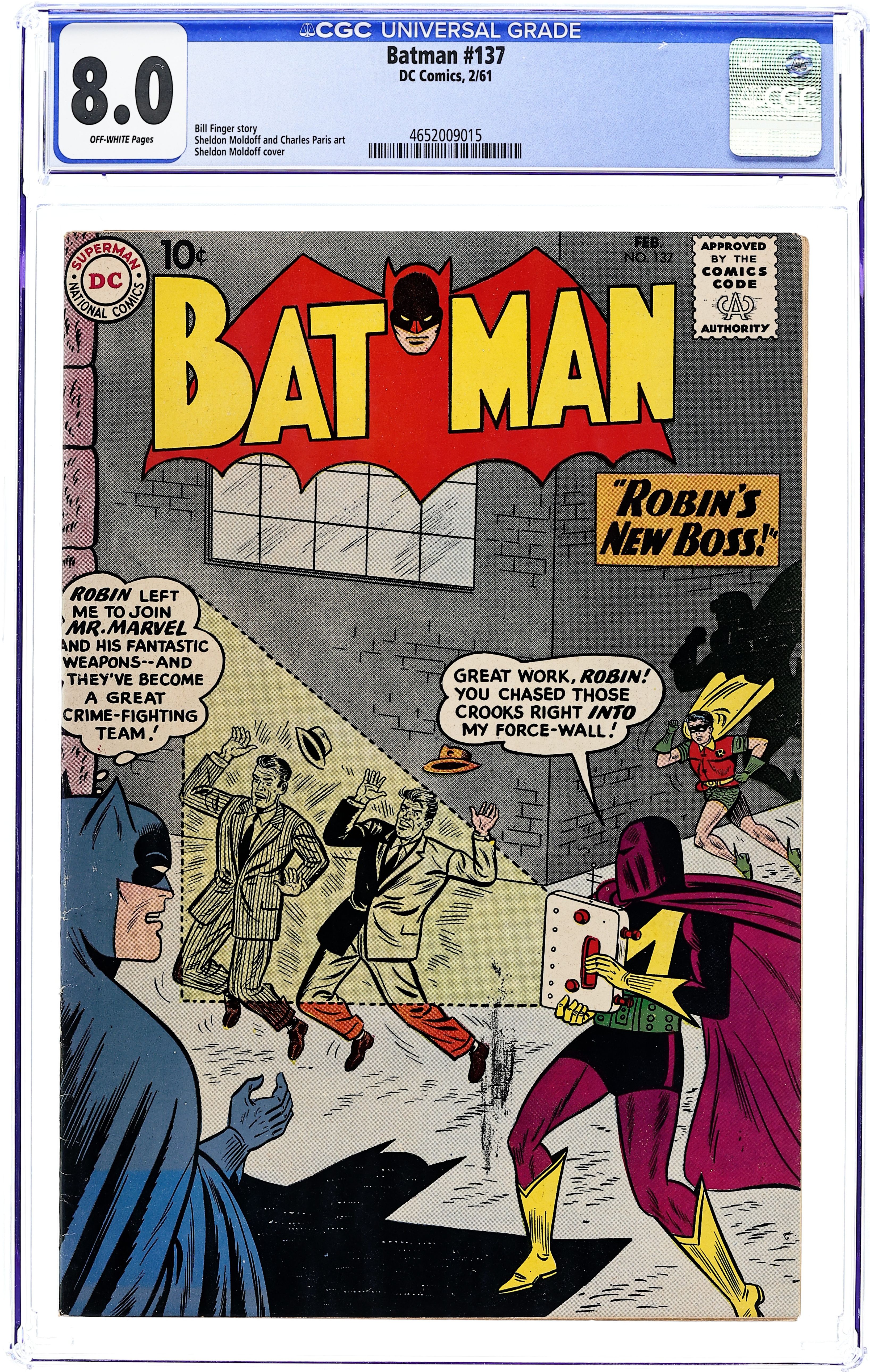 Starts Feb 9 Cover pencils by Carmine Infantino, inks by Murphy Anderson. "The Spark-Spangled See-Through Man!", script by Gardner Fox, pencils by Sheldon Moldoff (as Bob Kane), inks by Joe Giella and Jack Abel; Creegan steals some jewels from the laboratory of a scientist, who has treated the gems with radiation; During a battle with the Caped Crusaders, Creegan is transformed into a skeletal figure possessing a deadly electrical touch. Letter to the editor from comics writer Tony Isabella. Cap's Hobby Hints activity half-page by Henry Boltinoff. 36 Pages, Full Color. Cover price $0.12.