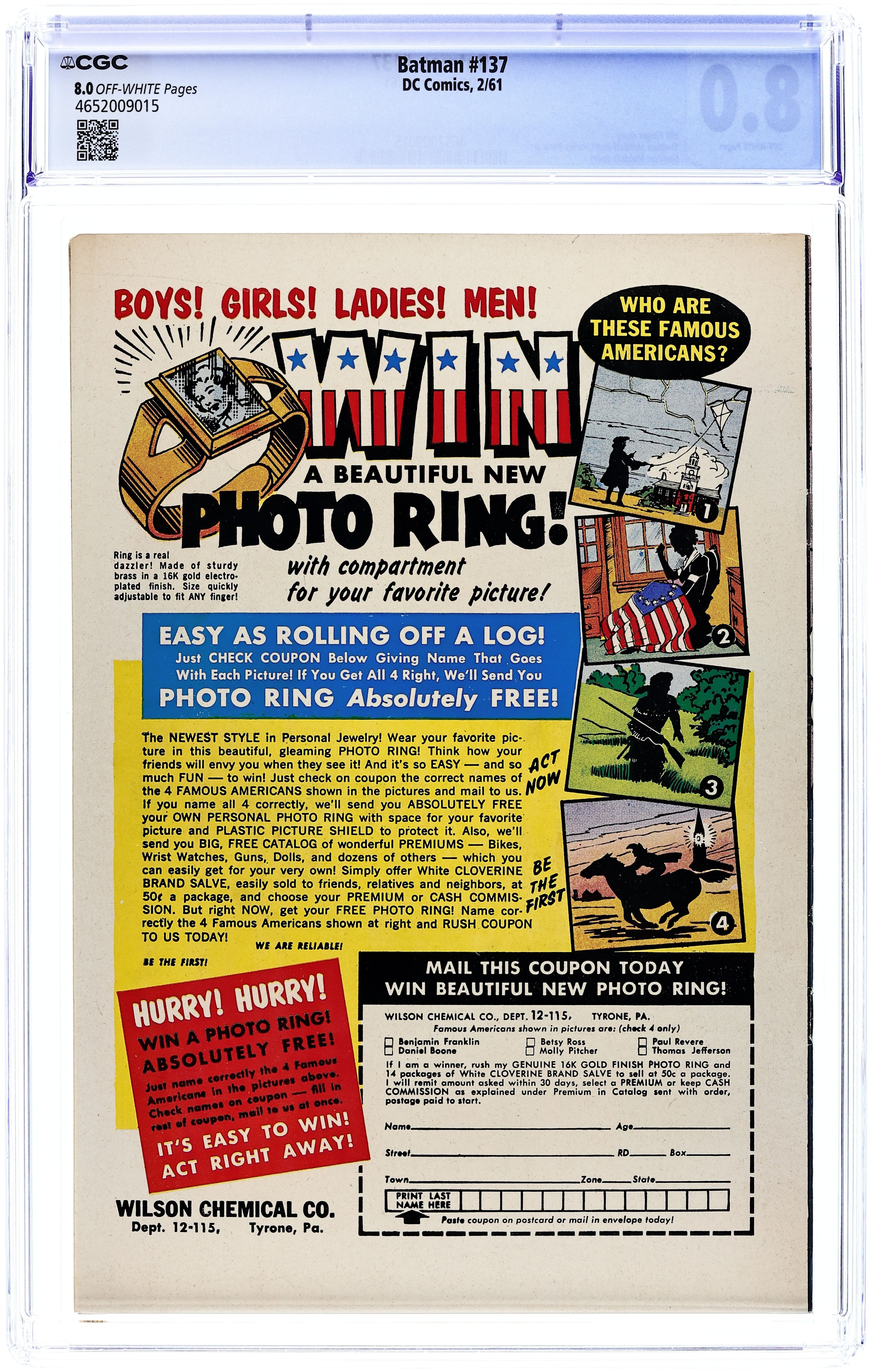 Starts Mar 2 Cover pencils by Carmine Infantino, inks by Murphy Anderson. "The Day Batman Sold Out!", script by Gardner Fox, pencils by Sheldon Moldoff (as Bob Kane), inks by Joe Giella; When Ira Radon absorbs so much radiation that he is forced to give up his life of crime, he decides to get revenge by dousing Batman's equipment with deadly radiation, forcing the Caped Crimefighter to give up his career. "Alfred's Mystery Menu!", script by Gardner Fox, pencils by Sheldon Moldoff (as Bob Kane), inks by Joe Giella; Alfred is kidnapped by a group of millionaire crooks, who demand that he fix a dinner fit for a millionaire. This he does, deliberately providing a code for the Dynamic Duo to decipher as to his whereabouts. Cap's Hobby Hints activity half-page by Henry Boltinoff. BEM Shows Up! public service announcement; BEM stands for Brains, Emotions and Muscles. 36 Pages, Full Color. Cover price $0.12.