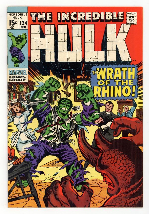 Starts Apr 20 Cover art by Herb Trimpe. The Rhino Says No!, script by Roy Thomas, art by Herb Trimpe; The Leader augments the Rhino's powers and sends him to bust up the Hulk's wedding day; Bruce and Betty almost get married but during the ceremony in the Ross living room, the Leader zaps Banner with a ray that returns him to mindless Hulk status and he and the Rhino wreck the Ross family home during their battle; The Leader escapes with the Rhino in tow and the Hulk leaps away, totally forgetting about Banner's nuptials. House ad for Sub-Mariner #22 and Sgt. Fury #74. 36 pgs. $0.15. Cover price $0.15.
