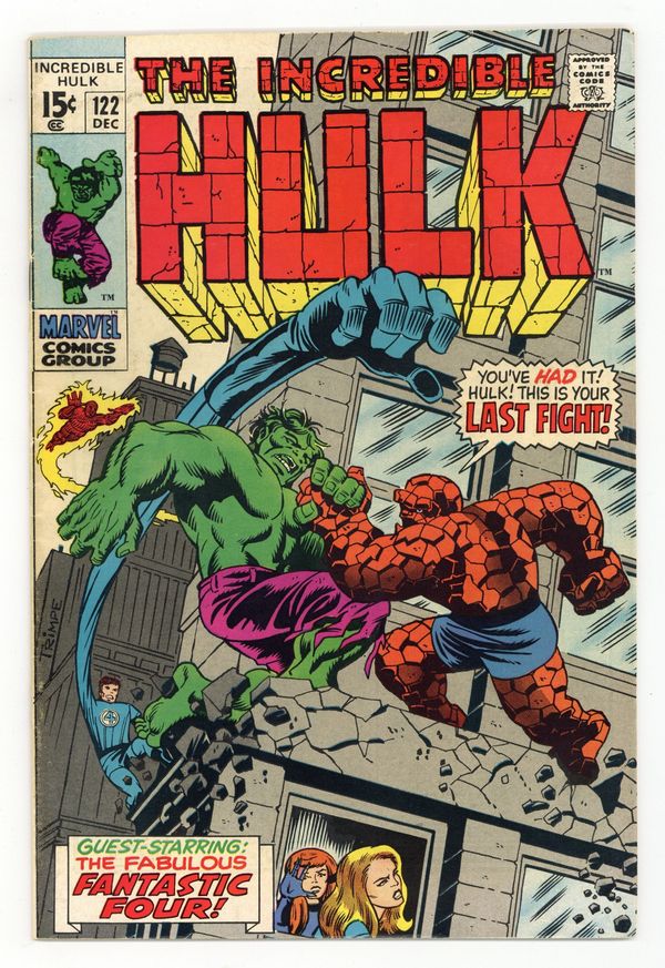 Starts Apr 20 Cover art by Herb Trimpe. The Hulk's Last Fight!, script by Roy Thomas, art by Herb Trimpe; Despairing after he turns into his human alter ego and finds that the Hulk has destroyed a train for no apparent reason, Bruce Banner finds a newspaper headline that asks him to come to New York as Mr. Fantastic believes that he has discovered a way to do away with the Hulk for good; Riding the rails to the Big Apple, Bruce tries to jot some notes of his own regarding Reed's process and secures them to his waist as he finds himself transforming once again into the Hulk to face down some pesky hoboes; By the time he makes it to the Baxter Building, our hero is once again in the form of Bruce Banner but an irate security guard makes his metabolism race and he changes into his monstrous alter ego; During Hulk's battle with the F.F., Sue notices as the pouch with Bruce's notes falls from the Hulk's waist and the Thing is called on to keep the jade giant occupied while Reed uses the new information to modify his weapon design in trying to banish the Hulk for good. 36 pgs. $0.15. Cover price $0.15.