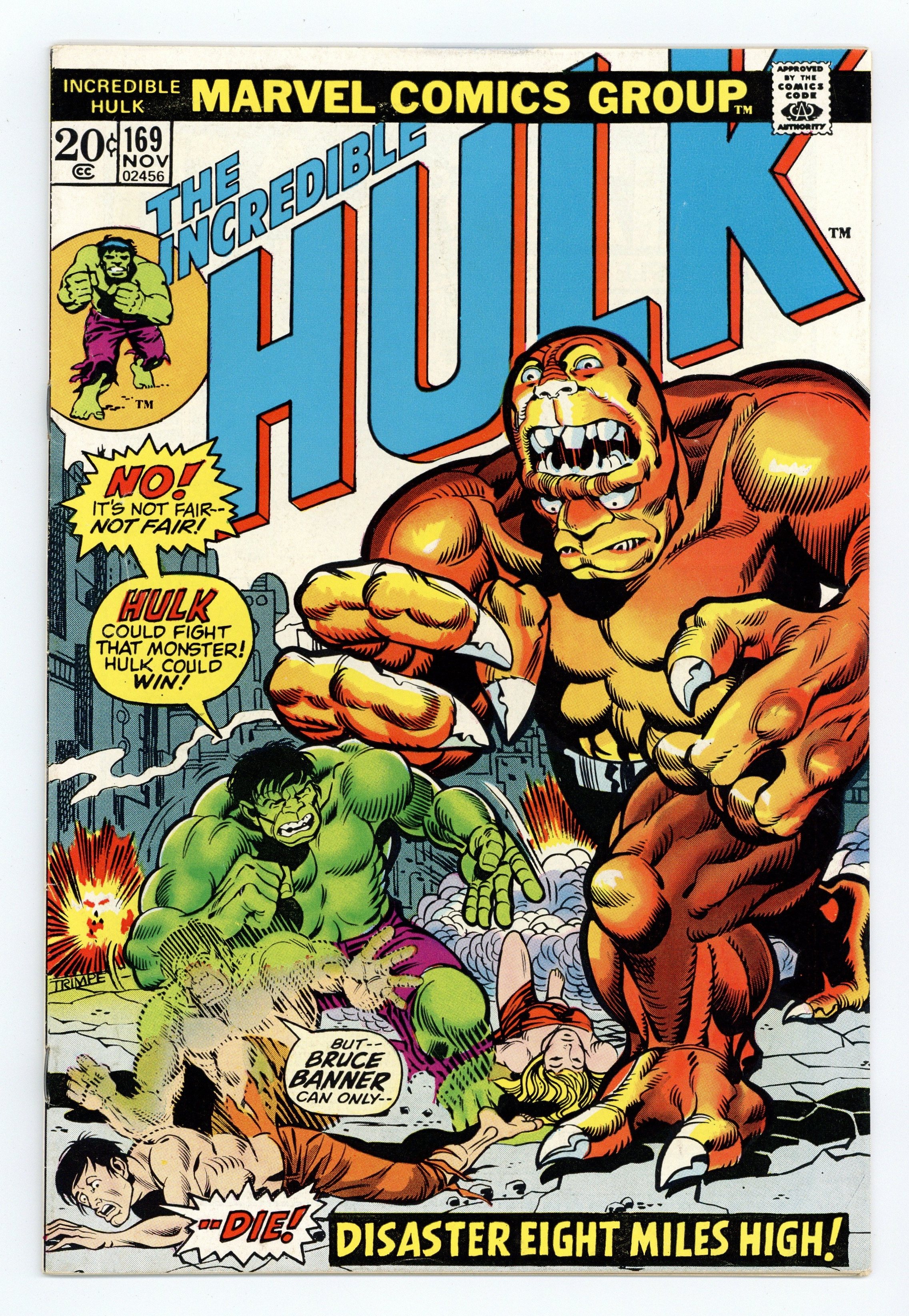 Cover art by Herb Trimpe. Calamity In the Clouds!, script by Steve Englehart, pencils by Herb Trimpe, inks by Jack Abel; The Harpy is flying off with the Hulk when they are both sucked up into a powerful tornado; They find themselves on a floating city and are confronted by its only inhabitant, the Bi-Beast; In the thin atmosphere, the Hulk transforms into Bruce and the Bi-Beast commands him to repair the city's broken down machinery; Instead, he uses the devices he finds to try and turn the Harpy back into Betty; M.O.D.O.K. arrives, takes down the Bi-Beast and decides to claim the city as his own; The Bi-Beast resists and sets the self-destruct; The Harpy turns back into Betty just as the city explodes. 36 pgs. $0.20. Cover price $0.20.