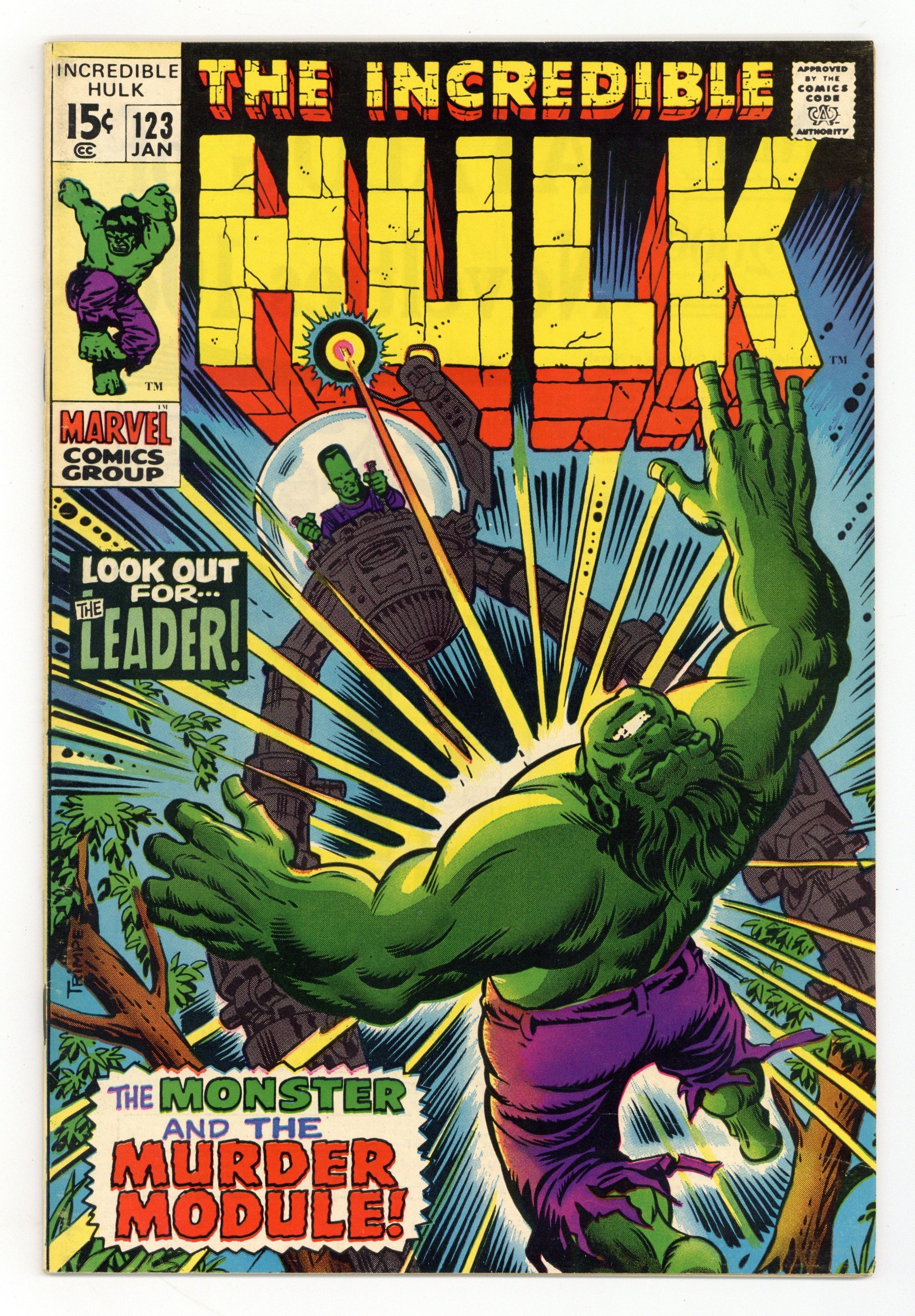 Starts Apr 20 Cover art by Herb Trimpe. No More the Monster!, script by Roy Thomas, art by Herb Trimpe; Mr. Fantastic uses a machine on the Hulk that turns him back into Bruce Banner and allows him to transform into the Hulk at will while still retaining his own intellect; Bruce vows never to become the Hulk again and reunites with Betty who accepts his proposal of marriage; Thunderbolt Ross also makes nice with his soon to be son-in-law but asks him to become the Hulk one last time to protect a new and deadly military weapon during transport; The Leader tries to steal the weapon but is stopped by the Hulk who finds himself feeling more savage as he almost kills his deadliest foe. 36 pgs. $0.15. Cover price $0.15.