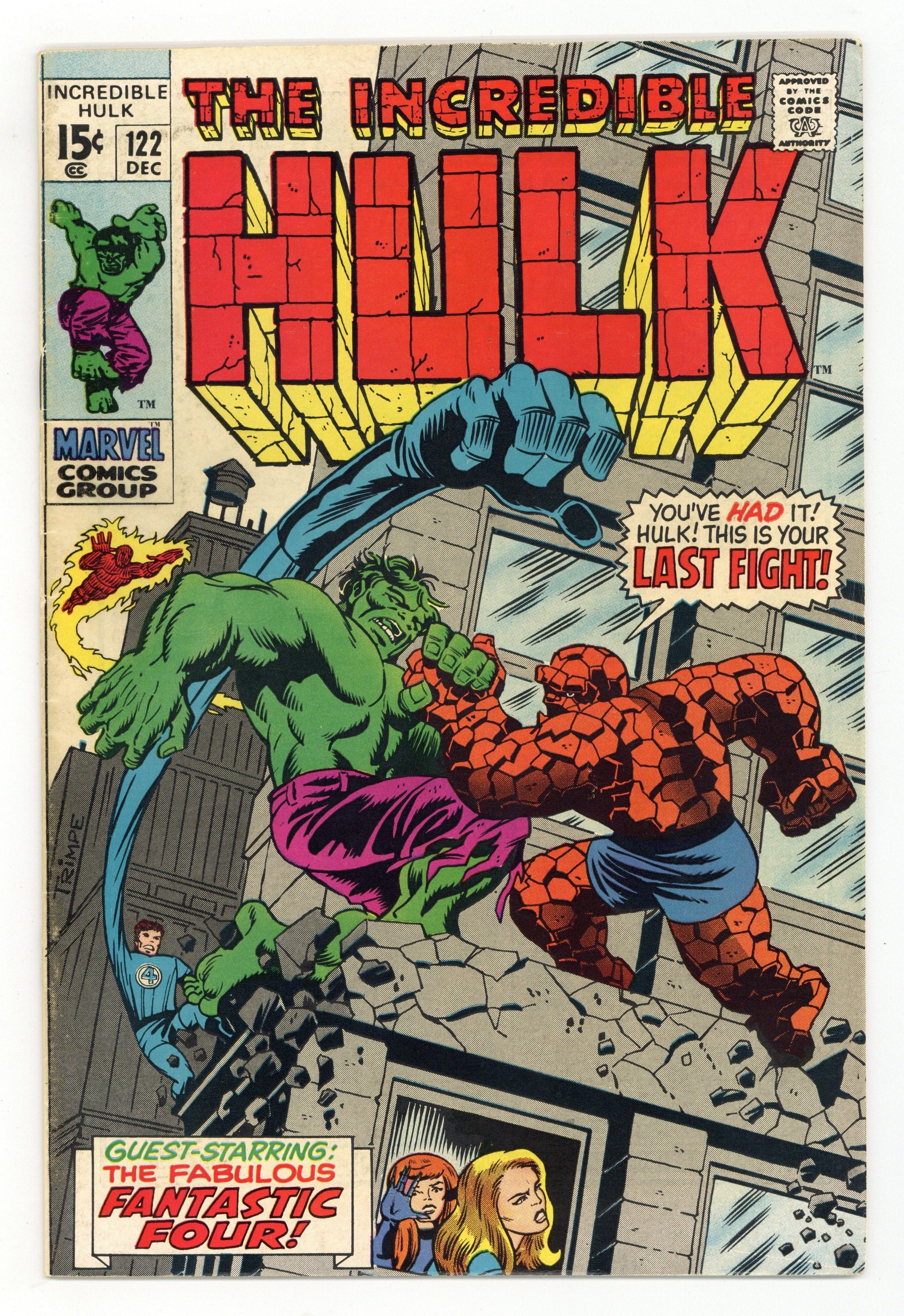 Starts Apr 4 Cover art by Herb Trimpe. The Hulk's Last Fight!, script by Roy Thomas, art by Herb Trimpe; Despairing after he turns into his human alter ego and finds that the Hulk has destroyed a train for no apparent reason, Bruce Banner finds a newspaper headline that asks him to come to New York as Mr. Fantastic believes that he has discovered a way to do away with the Hulk for good; Riding the rails to the Big Apple, Bruce tries to jot some notes of his own regarding Reed's process and secures them to his waist as he finds himself transforming once again into the Hulk to face down some pesky hoboes; By the time he makes it to the Baxter Building, our hero is once again in the form of Bruce Banner but an irate security guard makes his metabolism race and he changes into his monstrous alter ego; During Hulk's battle with the F.F., Sue notices as the pouch with Bruce's notes falls from the Hulk's waist and the Thing is called on to keep the jade giant occupied while Reed uses the new information to modify his weapon design in trying to banish the Hulk for good. 36 pgs. $0.15. Cover price $0.15.
