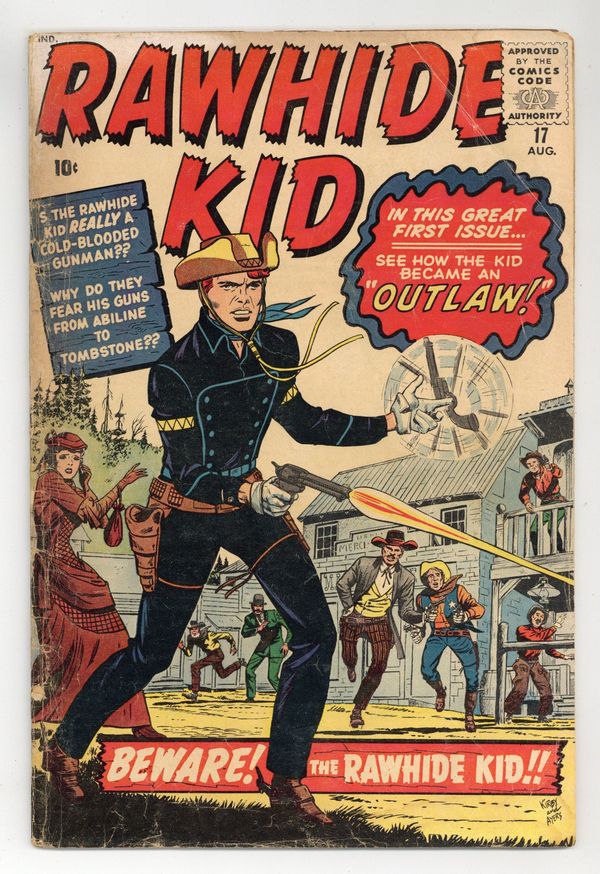 Starts Apr 4 Cover pencils by Jack Kirby, inks by Dick Ayers. "Beware! The Rawhide Kid," script by Stan Lee, pencils by Jack Kirby, inks by Dick Ayers; When Johnny Bart's uncle Ben Bart is gunned down by criminals, Johnny becomes the Rawhide Kid to stop them. "Dynamite Trail" text story, art by Joe Maneely. "Stagecoach to Shotgun Gap!", script by Stan Lee, pencils by Jack Kirby, inks by Dick Ayers; The Rawhide Kid prevents a stagecoach robbery. "With Gun in Hand!", script by Stan Lee, art by Don Heck; Les Cooper learns a lesson from his cousin Joe Cooper, who refuses to wear a gun. "When the Rawhide Kid Turned... Outlaw!", script by Stan Lee, pencils by Jack Kirby, inks by Dick Ayers; Rawhide Kid discovers who has been rustling Clay Rockwell's cattle; In the process of catching the rustler, Rawhide Kid becomes an outlaw. 36 pgs., full color. Cover price $0.10.