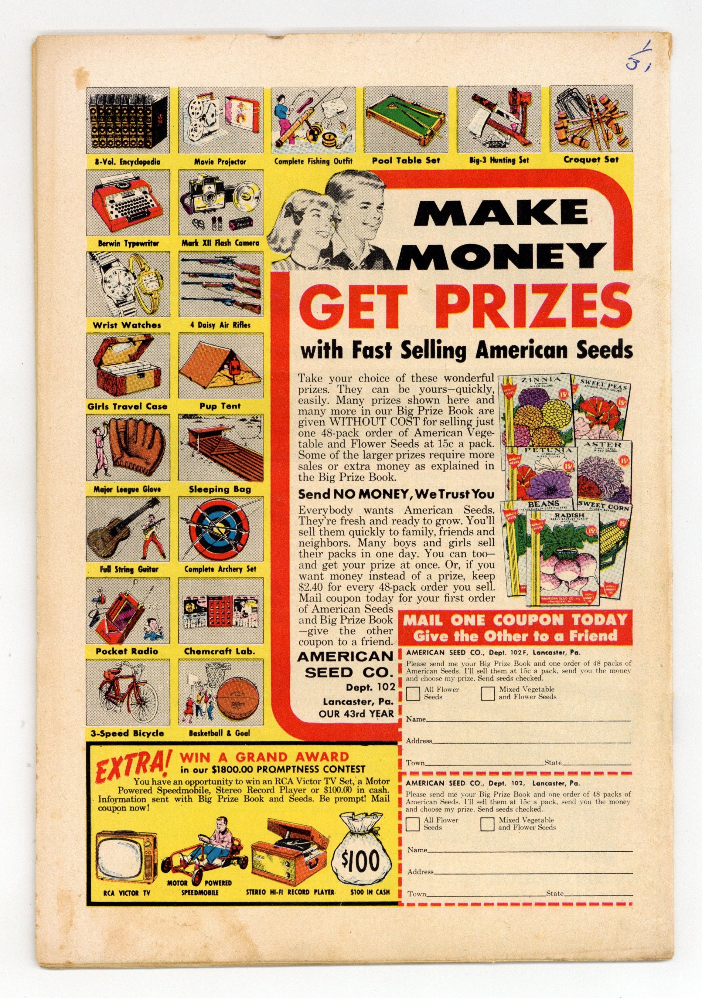 Starts Jan 26 Cover art by Fred Kida. "The Eighth Wonder of the World," art by Richard Doxsee; Four conmen come up with an idea to dig up a giant that they plant in the earth and exhibit it to make money but they disturb a real giant with their scheme. "Only One Returned," art by John Forte; Two men descend into a cave shaft and one plots to dispose of the other so that he can marry his girlfriend; He cuts the rope and the other man falls into the river. "The Swami's Secret," art by Bob Bean; A mind-reading swami is undone when he comes across an individual he believes is an alien preparing to invade; He signs a confession to the police that he has been swindling wealthy clients for years but thinks the occasion is important enough to reveal his secret ability. "The Second-Hand Man!", art by Ed Winiarski; When a law-abiding man buys a used car that had belonged to an executed gangster, he finds himself behaving in reckless and aggressive ways. "The Missing Tooth" text story. "The Missing Sun," script by Carl Wessler, art by Matt Fox; A giant insect blots out Earth's sun and even more giant creatures save Earth by getting the insect to leave. "Bewitched!", art by Bob Powell; The book of Genda, a yogi fanatic, holds a town paralyzed until a man's glasses slip off his face and light magnified through one of the lenses burns up the pages. 36 pgs., full color. Cover price $0.10.