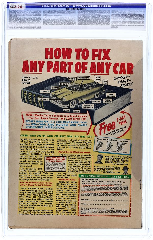 Starts Jul 4 Cover by Jack Davis. EC Artist of the Month article about George Evans (with photo) by Al Feldstein. "Fare Tonight, Followed By Increasing Clottyness...", script by Al Feldstein, art by Jack Davis; A cab driver has a dream that he is pursued by a Dr. Mueller into a basement filled with vampire-occupied caskets. "Curiosity Killed...", script by Al Feldstein, art by George Evans; A woman is convinced that her friend down the hall has been murdered by her husband and that he is disposing of her remains bit by bit via carrier pigeon to a local kennel. "Tight Squeeze" text story. "How Green Was My Alley," script by Al Feldstein, art by Jack Kamen; A bigamist is decapitated by his two athletic wives when they find they've been deceived; The golfer putts with his eyes and the bowler uses his severed head. "The Handler," script by Ray Bradbury and Albert B. Feldstein (adaptation), art by Graham Ingels (as Ghastly); A mortician avenges himself against perceived slights upon the closed-casket victims of his parlor by violating their bodies until a corpse who isn't quite dead yet overhears his gruesome doings and begs the dead to rise from their graves and stop this horrid man. 36 pgs., full color. $0.10. Cover price $0.10.
