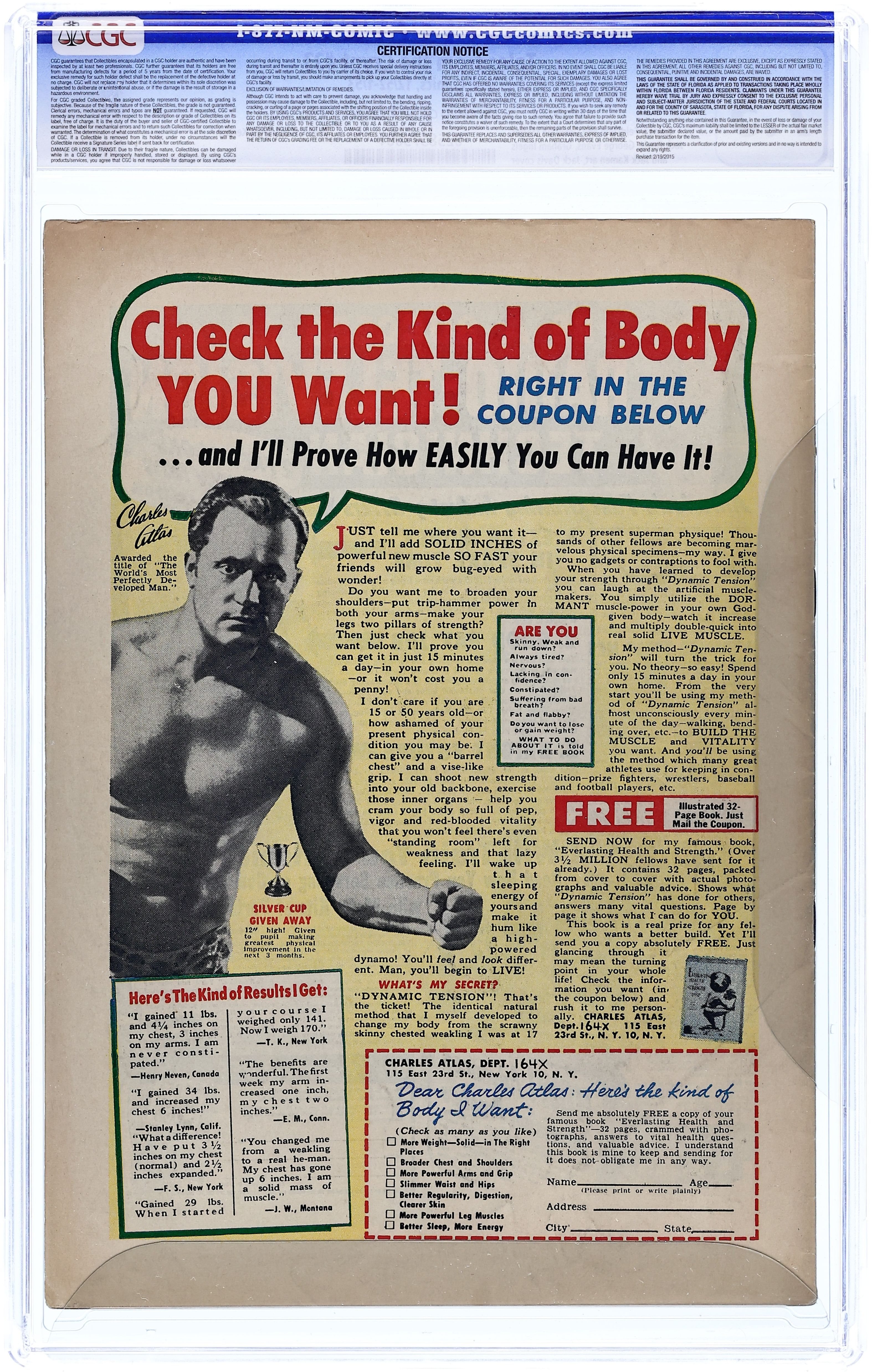 Starts Jul 4 First issue of the series (continues from The Crypt of Terror). Cover by Johnny Craig. "The Thing From the Sea," script and art by Al Feldstein; During a sea voyage a passenger discovers that stateroom 13 has the reputation of being haunted. "A Fatal Caper," script by Al Feldstein, art by Jack Kamen; Teenagers remove a body from a casket in order to dress as a mystically-summoned monster and place one of their own inside as a prank; the undertaker is unaware of this and buries the body. "Backfire" text story. "Rx...Death," script by Al Feldstein, art by Graham Ingels; A sister worries that her brother is under too much stress and so asks a doctor to write a prescription for some medicine. "Impending Doom," script by Al Feldstein, art by Johnny Craig; An artist draws a frightened face with a circle around it; Thinking it odd, he goes for a walk encountering a grave-stone cutter who looks like the picture he drew carving a tombstone with his name on it. 36 pgs., full color. $0.10. Cover price $0.10.