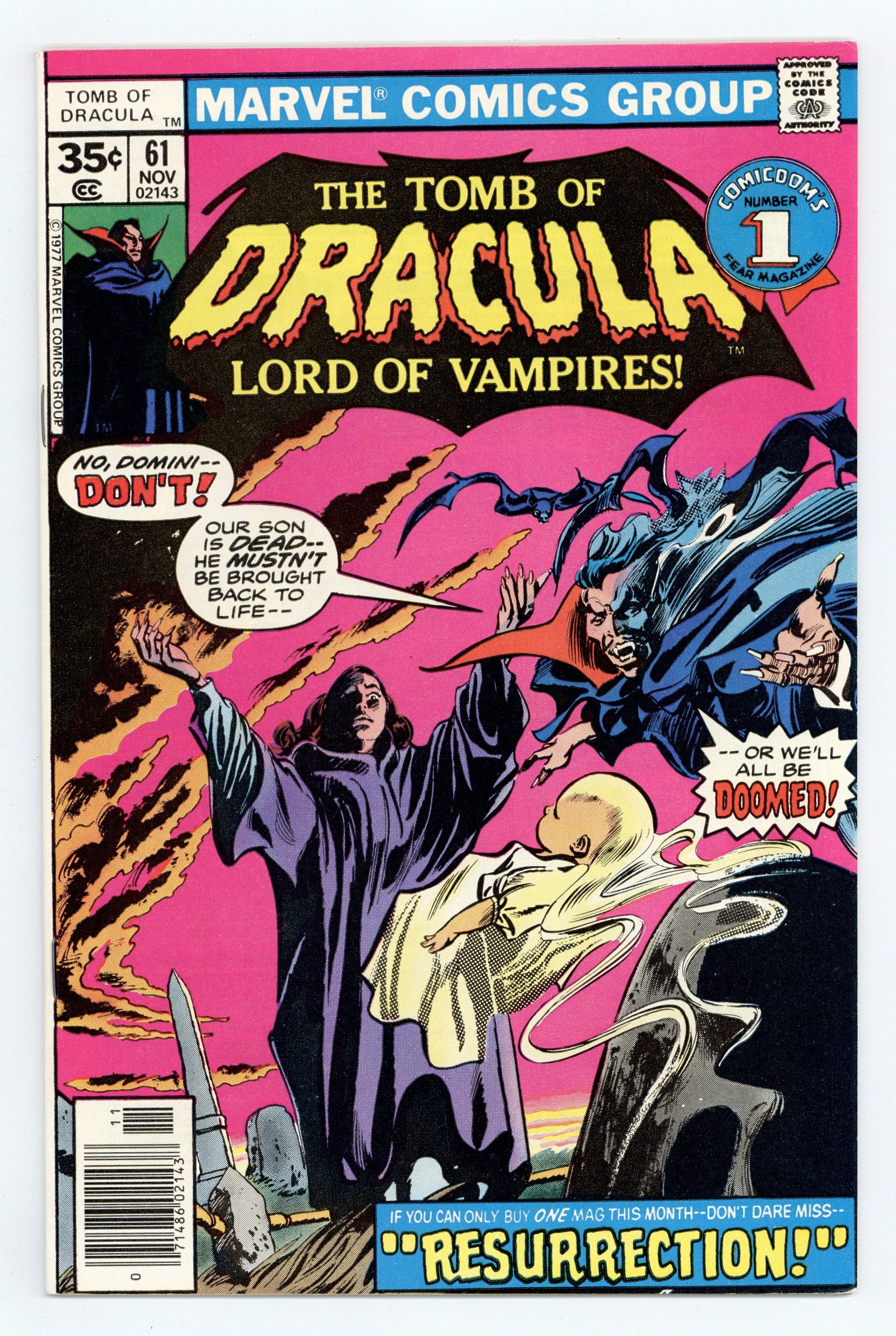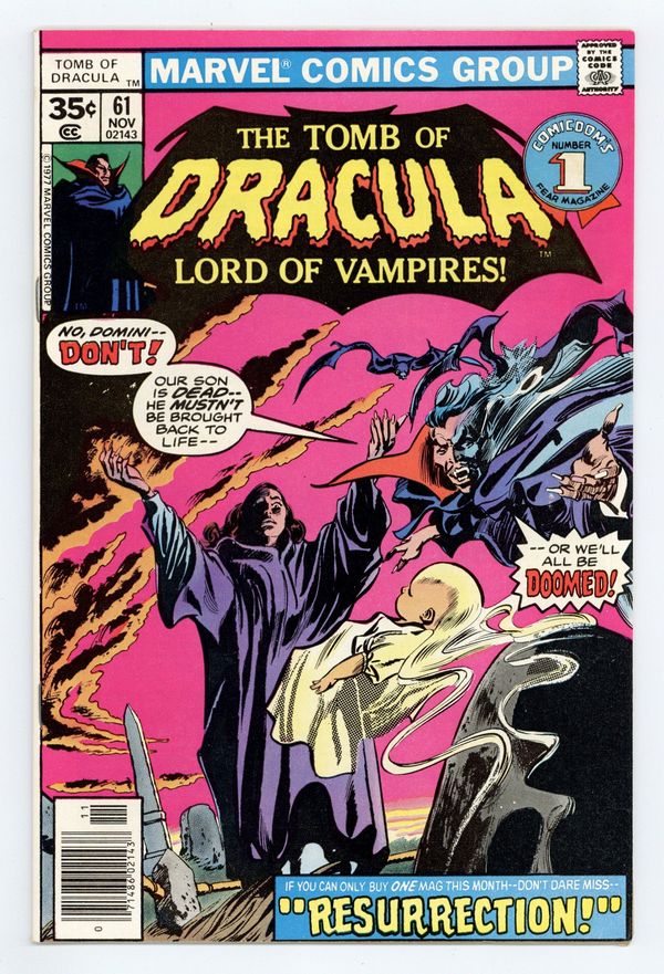 Starts Mar 2 35-cent cover price begins. Dracula's wife Domini raises their son from the dead in "Resurrection!" Script by Marv Wolfman, pencils by Gene Colan, inks by Tom Palmer. Colan/Palmer cover. Cover price $0.35.