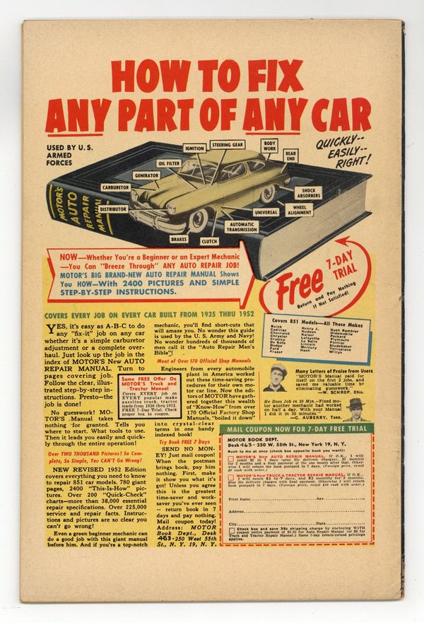 Ends Apr 13 8:13 PM CST Bid History no bids Minimum Bid $1 Your Secret Max Bid If you'd like to bid, please log in or register. Pre-Code horror comics from Ajax-Farrell and their anonymous talents. A scientist makes mental contact with an executed convict's preserved brain. A movie actor drafted to the Korean front uses makeup to fake his own death, but it works too well. A dying plastic surgeon reveals he changed Hitler's face after WWII. Trail to a Tomb; The Corpse Who Killed; Harbinger of Violence; Two on the Aisle... Of Death!; Screams in the Night. 36 pages, Full Color. Cover price $0.10.
