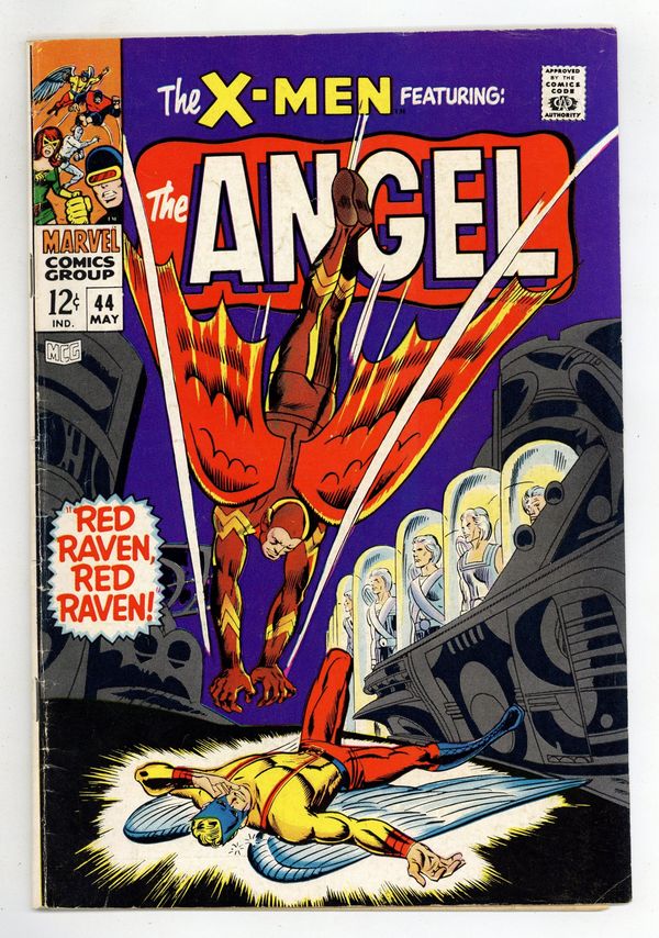 First silver age appearance of the golden age Red Raven in "Red Raven, Red Raven..." Plot by Roy Thomas. Script by Gary Friedrich. Art by Don Heck (layouts), Werner Roth (pencils), and John Tartaglione (inks). Cover by Don Heck (pencils) and John Tartaglione (inks) with Marie Severin (alterations). The Uncanny X-Men have gone down to defeat at the hands of the Brotherhood of Evil Mutants! But auspiciously for the young mutants, Quicksilver convinces Magneto to spare their lives and keep Professor X's charges as prisoners instead! While in captivity the resourceful Angel escapes from his cage! Warren wants to free his friends next; however, Cyclops tells him to leave now and fly to Avengers Mansion! Angel starts flying east where he unbelievably runs into Sky-Island - the home of Red Raven and the bird-people! Wow, what a blast from the past! Is Red Raven going to help Angel or harm him? Appearances by the Scarlet Witch and Toad. Second story: "The Iceman Cometh!" Script by Gary Friedrich. Pencils by George Tuska. Inks by John Verpoorten. This five-page story presents the origin of Iceman (aka Bobby Drake). Cameo appearances by Professor X and Cyclops. (Notes: Red Raven previously appeared in Red Raven Comics (1940) #1. The letters page includes a letter from comics artist Keith Giffen. This story was reprinted in Uncanny X-Men #92.) 36 pages. Cover price $0.12.