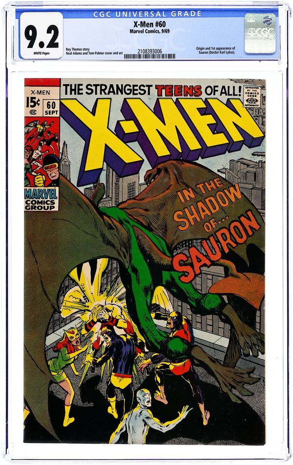 1st Printing. 1st appearance of Sauron. Cover pencils by Neal Adams. In the Shadow of...Sauron!, script bny Roy Thomas, pencils by Neal Adams, inks by Tom Palmer, colors by Neal Adams; The X-Men take an injured Havok to be treated by one of Xavier's old buddies, Dr. Karl Lykos; Lykos is an energy vampire and drains mutant life energy from Havok, turning himself into the evil Sauron; Angel takes off to investigate the flying dinosaur and is hypnotized by Sauron's powers. Letter from comics creator Don McGregor. 36 pages, full color. NOTE: JC Penney reprint exits. Can be identified by having X-Men on Video ad on back cover. Cover price $0.15.