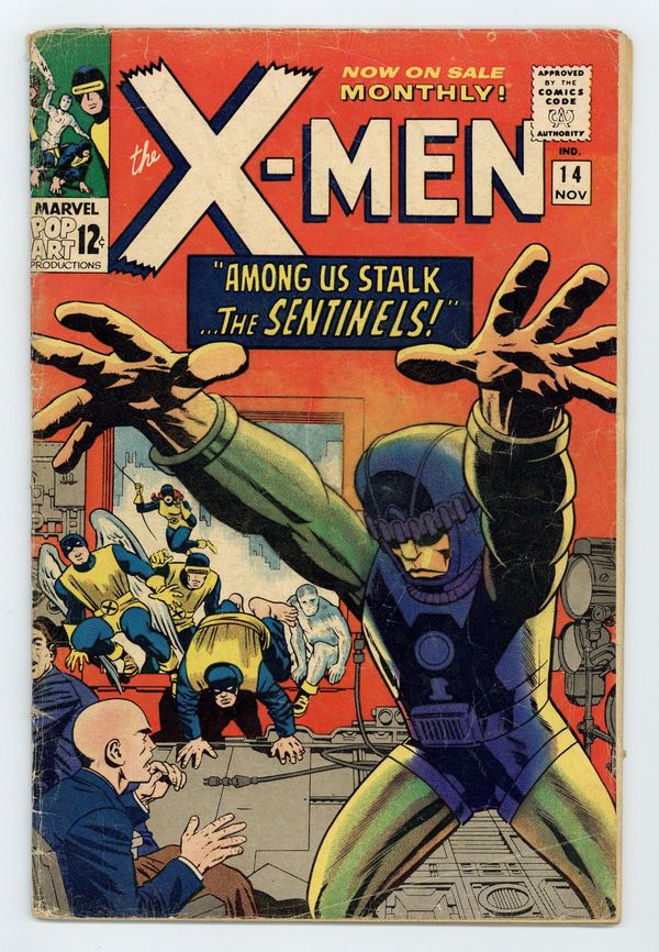 Cover pencils by Jack Kirby, inks by Wally Wood. Among Us Stalk...The Sentinels!, script by Stan Lee, pencils by Jack Kirby (layouts) and Werner Roth [as Jay Gavin] (pencils), inks by Vince Colletta; After their battle with the Juggernaut, Xavier sends the X-Men on vacation; Reading a story in the paper about Dr. Trask and his story on the mutant menace, Professor X calls for a televised debate with the anthropologist; During the broadcast, Trask unveils his Sentinels, robots who were built to capture and nullify mutants, but things quickly get out of hand as the Sentinels proclaim themselves superior to puny humans and prepare to take over; Xavier calls his X-Men to help and they return to battle the Sentinels; When one of their number falls, the giant robots capture Trask and return to their base; The X-Men follow and find a hidden complex complete with devastating weaponry aimed directly at them; 1st appearance of the Sentinels. 36 pgs. $0.12. Cover price $0.12.