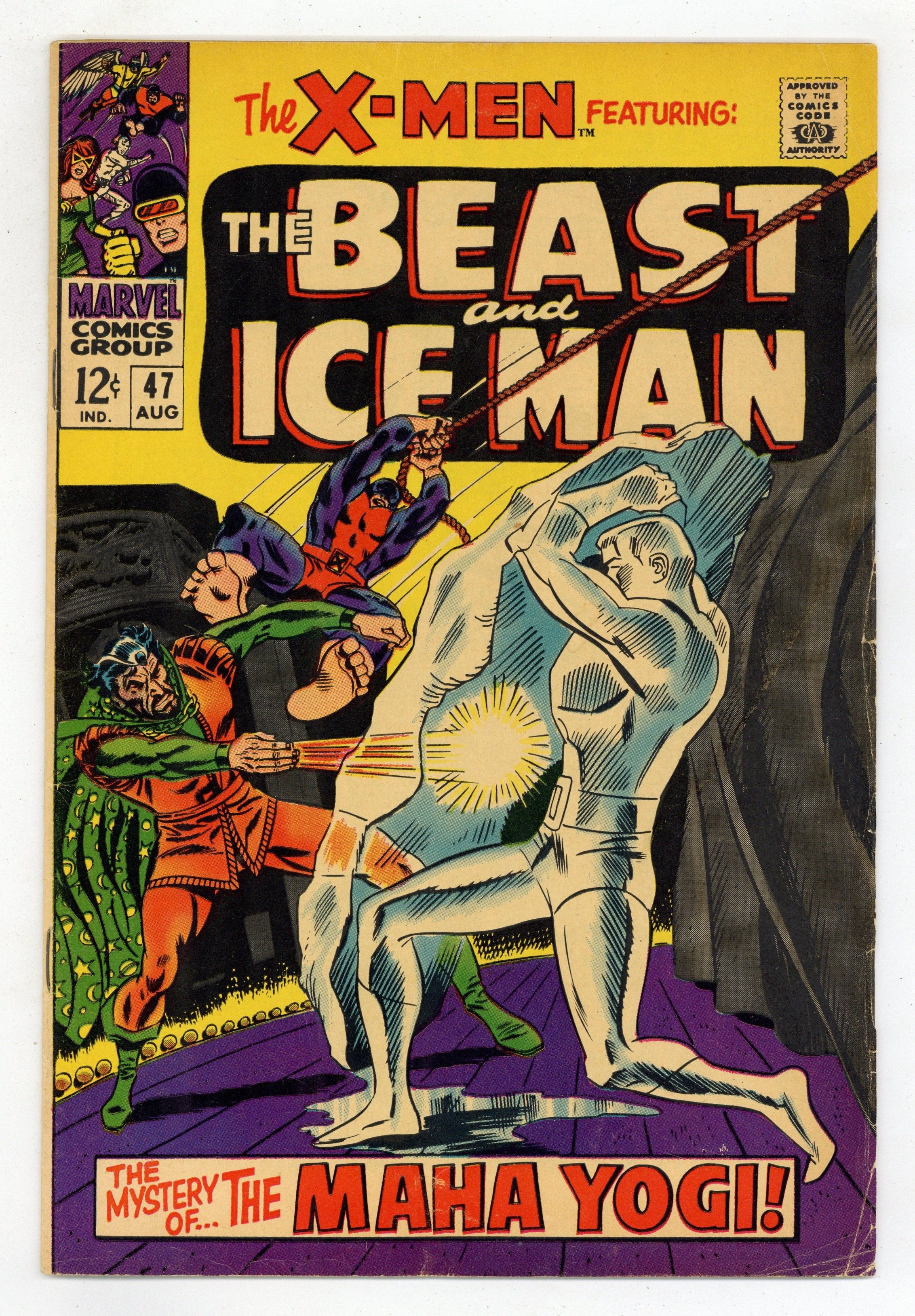 Cover pencils by Don Heck, inks by Frank Giacoia. The Warlock Wears Three Faces!, script by Gary Friedrich and Arnold Drake, pencils by Don Heck (layouts) and Werner Roth, inks by John Tartaglione; Iceman and Beast go with Vera and Zelda to watch Maha Yogi, a magician; Yogi, who is revealed to be Warlock, hypnotizes the crowd and everyone becomes a human bomb. I, the Iceman, script by Arnold Drake, pencils by Werner Roth, inks by John Verpoorten; explanation of Iceman's powers. 36 pgs. $0.12. Cover price $0.12.