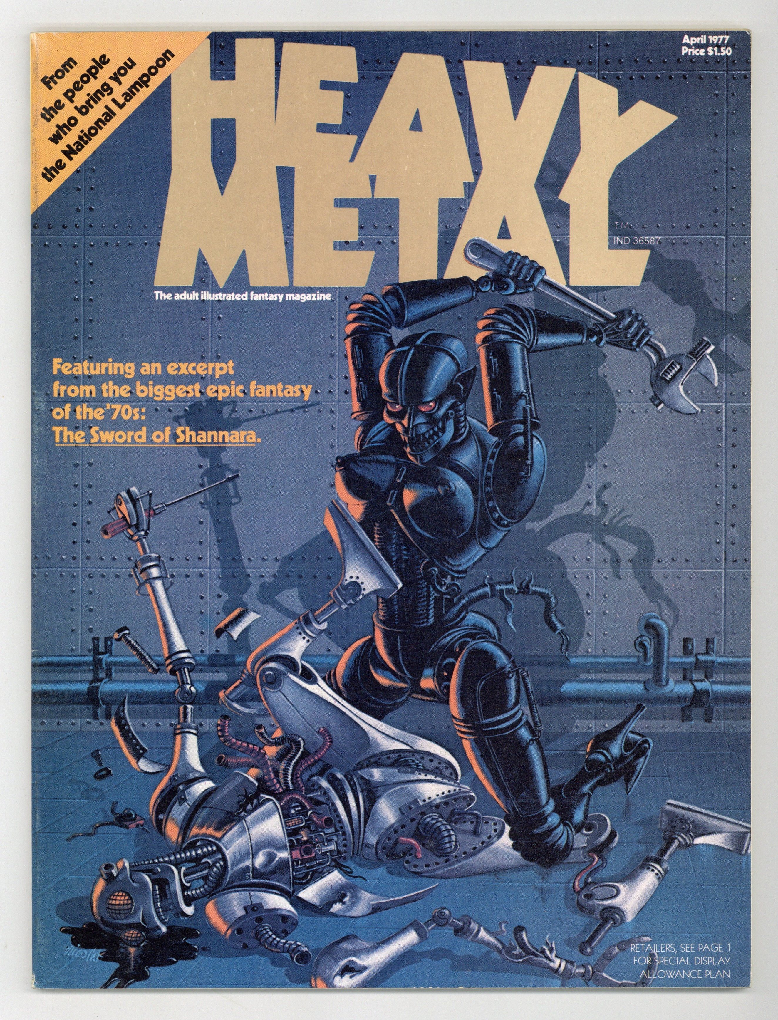 Starts Dec 8 Rich Corben, Moebius, & Bode art April, 1977, issue 1. Dubbed "The adult illustrated fantasy magazine," Heavy Metal also publishes tales of horror, science fiction, and adventure. This first issue includes the following stories: Den by Richard Corben; Rut by Druillet; Conquering Armies by Dionnet and Gal; The Adventures of Yriss by Druillet and Alexis; Azrach by Moebius; Selenia by Marre and Macedo; The Sword of Shannara by Terry Brooks; Traumwach by Mouchel, Pierson, and Voss; Space Punks by Mezieres; Age of Ages by Rubington; 1996 by Montellier; Sunspot by Vaughn Bodé; and Manipulation by Roy. Cover art by Nicollet. Cover price $1.50.