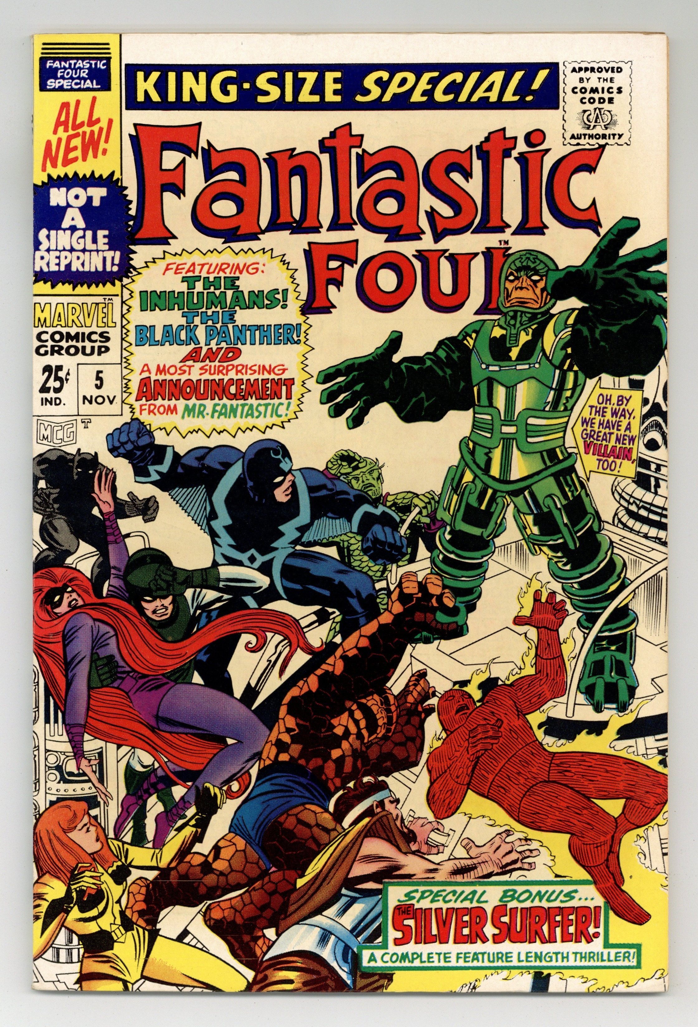 Starts May 4 The Black Panther and the Inhumans help the FF battle Psycho-Man (his first appearaince) in "Divide and Conquer!" Script by Stan Lee, pencils by Jack Kirby, inks by Frank Giacoia (not Joe Sinnott as credited). Silver Surfer back-up (first solo story), "The Peerless Power of the Silver Surfer!" by Lee/Kirby/Giacoia. This issue also has eight pages of pin-ups by Kirby/Giacoia and a short story, "This Is a Plot?" Script and pencils by Kirby, inks by Giacoia. Kirby/Giacoia cover. 68 pages, full color. Cover price $0.25.