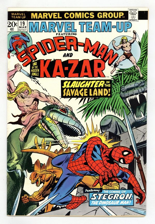 Starts Dec 8 Spider-Man and Ka-Zar in "The Coming of Stegron the Dinosaur Man!" Part 1 of 2. Script by Len Wein. Pencils by Gil Kane. Inks by Mike Esposito and Frank Giacoia. Cover by Gil Kane and Frank Giacoia. Spider-Man and Ka-Zar battle Stegron in the Savage Land. First appearance of Stegron. (The wall-crawler previously visited the Savage Land in Amazing Spider-Man 104. This issue was reprinted in Marvel Treasury Edition 22. The letters page contains Marvel Value Stamp Series A #90 Hercules.) Note: First appearance of Stegron. 36 pgs. Cover price $0.20.