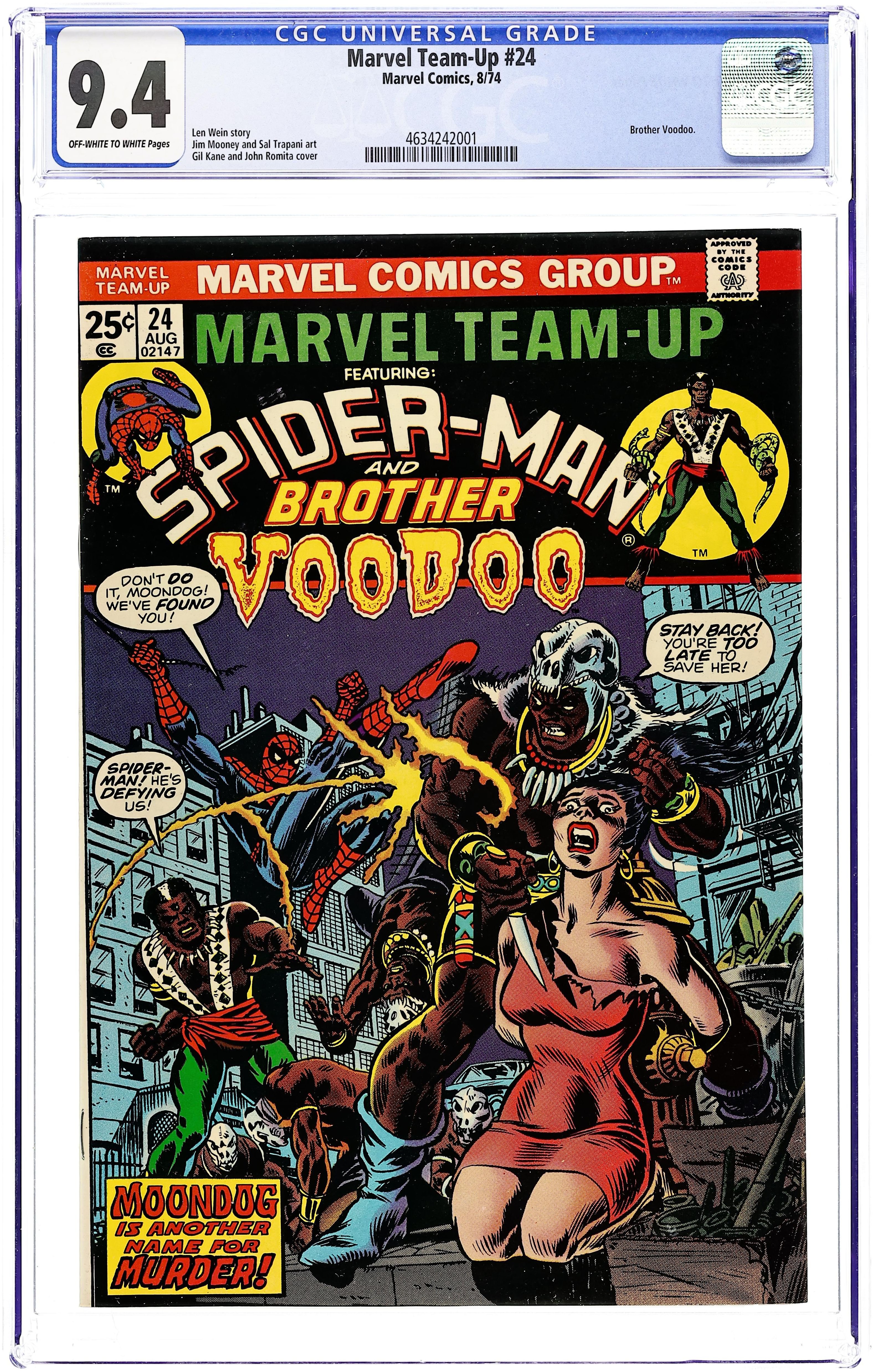 Ends Dec 8 8:55 PM CST Bid History 6 bids Current Bid $31 Your Secret Max Bid If you'd like to bid, please log in or register. "Moondog is Another Name for Murder!" Guest-starring Spider-Man and Brother Voodoo. Script by Len Wein. Pencils by Jim Mooney. Inks by Sal Trapani. Cover by Gil Kane and John Romita. Spider-Man gets mixed up in a supernatural slugfest between Moondog and Brother Voodoo! (Note: The letters page contains Marvel Value Stamp Series A #90 Hercules.) 36 pages. Cover price $0.25.
