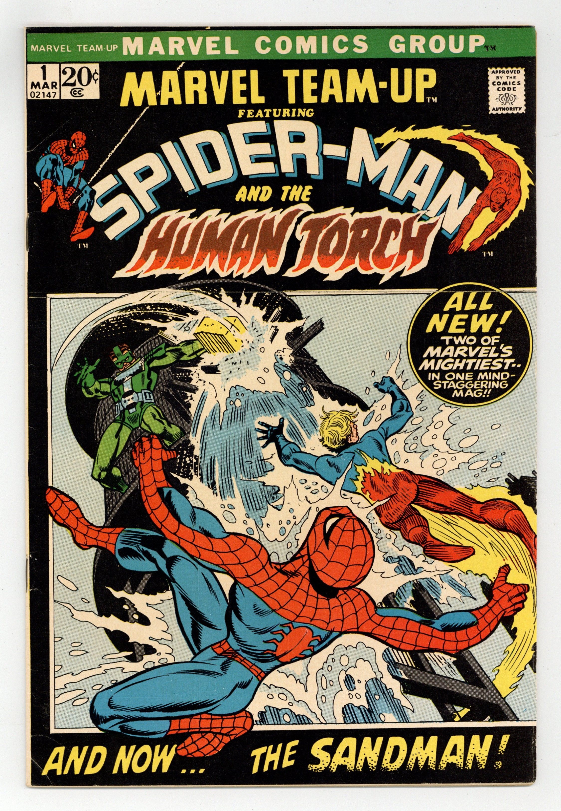 Starts Dec 8 "Have Yourself a Sandman Little Christmas!" Guest-starring Spider-Man and the Human Torch. Script by Roy Thomas. Pencils by Ross Andru. Inks by Mike Esposito. Cover by Gil Kane and Frank Giacoia. A second monthly series for the Amazing Spider-Man begins with a team-up with his friendly rival in the Fantastic Four! After bumping into the Sandman on a New York beach, the web-slinger rushes to the Baxter Building! Only Johnny Storm is home on Christmas Eve, and he agrees to help Spider-Man track down the Sandman. The wall-crawler and the torch locate their foe in New Jersey, and the breakneck battle begins! Will Spider-Man and the Human Torch go easy on the Sandman? 'Tis the season! First appearance of Misty Knight (unnamed in the story). (Notes: The Marvel Team-Up title is published bi-monthly thru issue #7. Amazing Spider-Man (1st series) 106 is also published this month. This story was reprinted in 1974 in the Marvel Treasury Special - Superhero Holiday Grab Bag.) 36 pages. Cover price $0.20.