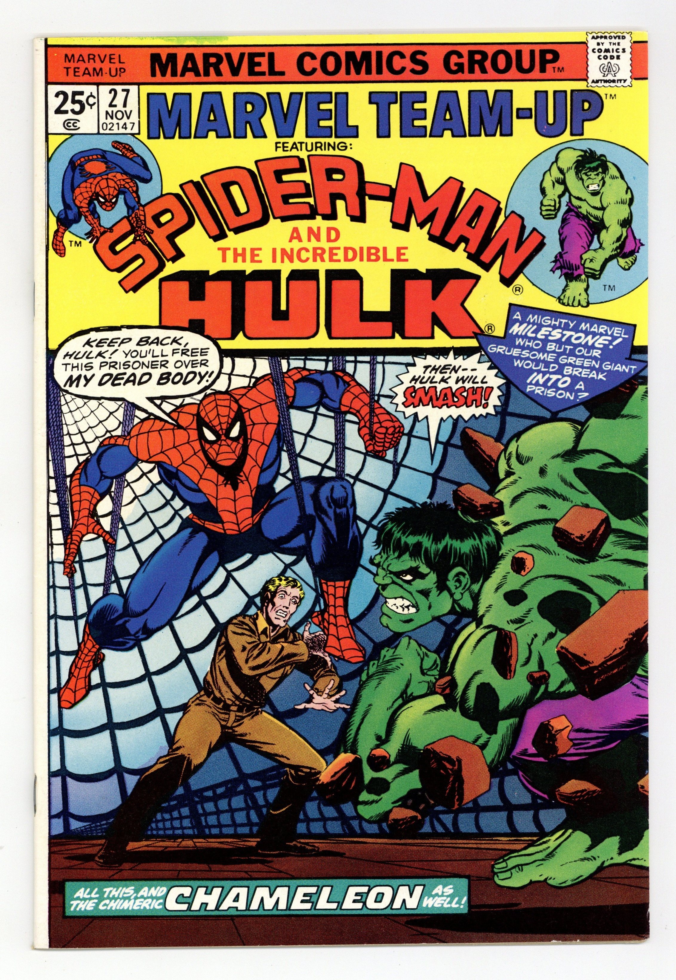 Starts Dec 15 "A Friend in Need!" Guest-starring Spider-Man and the Hulk. Script by Len Wein. Pencils by Jim Mooney. Inks by Frank Giacoia and Dave Hunt. Cover by Jim Starlin. The crafty Chameleon tricks the Incredible Hulk into helping him break a friend out of prison! Can Spider-Man stop them? Cameo appearance by Ned Leeds. (Notes: This issue was reprinted in Marvel Treasury Edition 27. The letters page contains Marvel Value Stamp Series A #68 Son of Satan.) 36 pages Cover price $0.25.