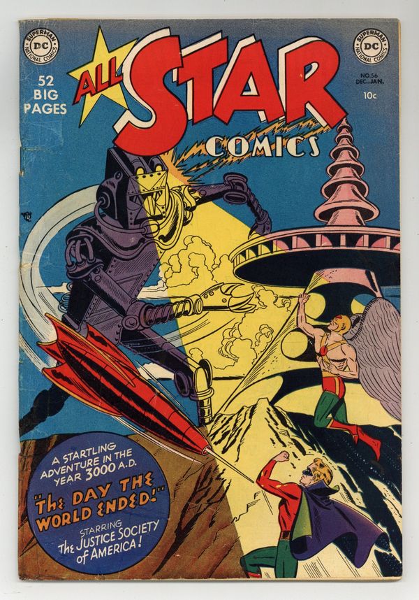 Starts Jul 4 The Justice Society of America fight robots in the year 3000 A.D. in "The Day the World Ended." Script by John Broome, pencils by Frank Giacoia (chapters 1, 3, and 4) and Arthur Peddy (chapter 2), inks by Giacoia (chapters 1, 3 and 4) and Bernard Sachs (chapter 2). Back-up Johnny Peril's Surprise Story, "The Girl From Aquaterra." Two-page article, "How Far is Far Away?" Peddy/Sachs cover. 52 Pages, Full Color. Cover price $0.10.