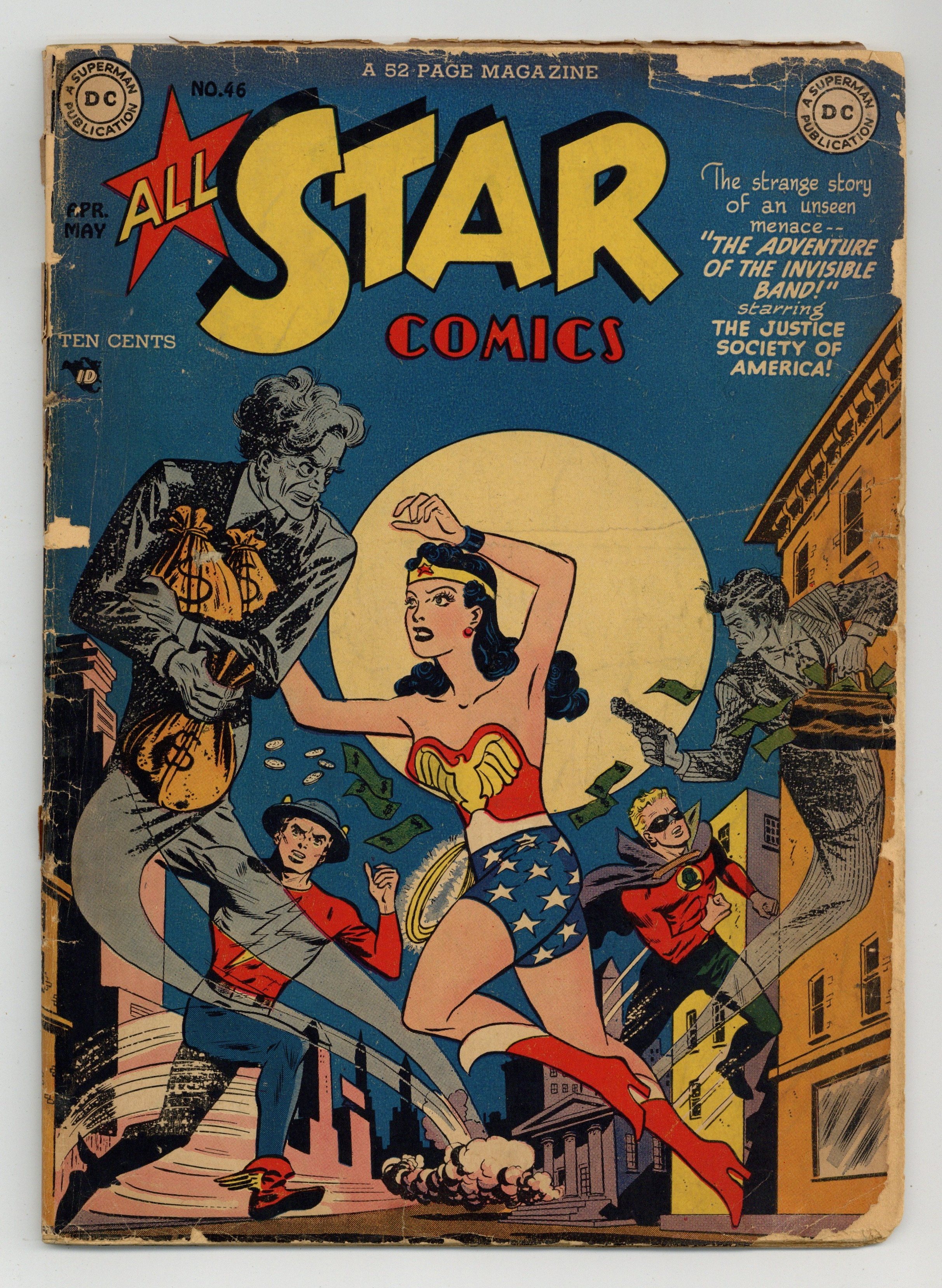 Starts Apr 4 The Justice Society of America in "The Workshop of Willie Wonder." Script by Gardner Fox. Art by Martin Naydel plus individual stories featuring Hawkman (art by Jon Chester Kozlak), Dr. Mid-nite (art by Stan Aschmeier as "Stan Josephs"), Green Lantern (art by Paul Reinman), the Atom (pencils by Irwin Hasen, inks by Kozlak), Johnny Thunder (art by Aschmeier), and the Flash (art by Naydel). Wonder Woman cameo. Two-page text story, "Showdown Stuff" by Jim Robinson. One-page Tootsie Roll ad, "Captain Tootsie and the Wolf Hunt" by C.C. Beck and Pete Costanza. Naydel cover. 52 Pages, Full Color. Cover price $0.10.