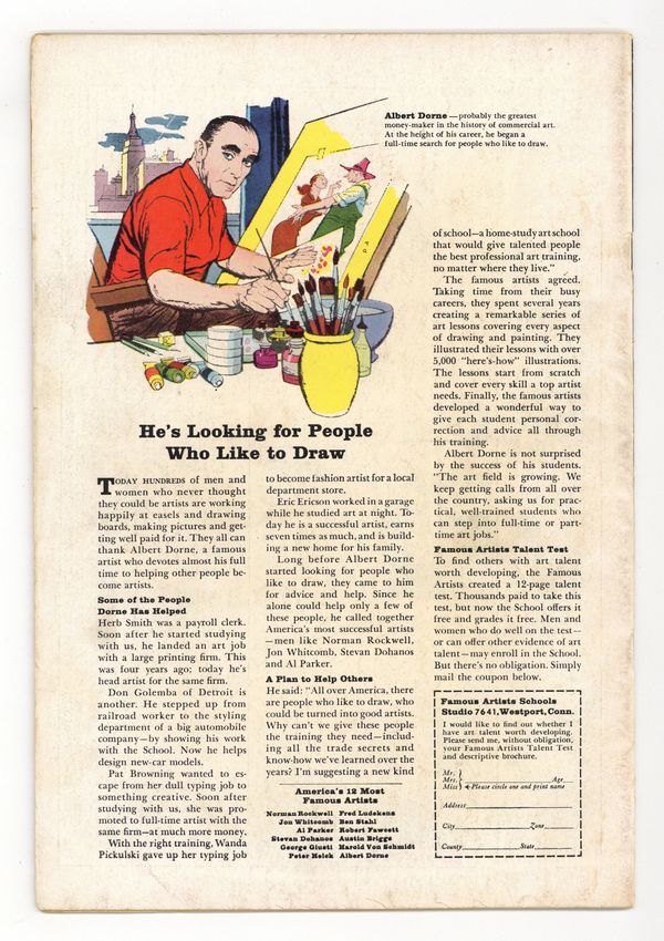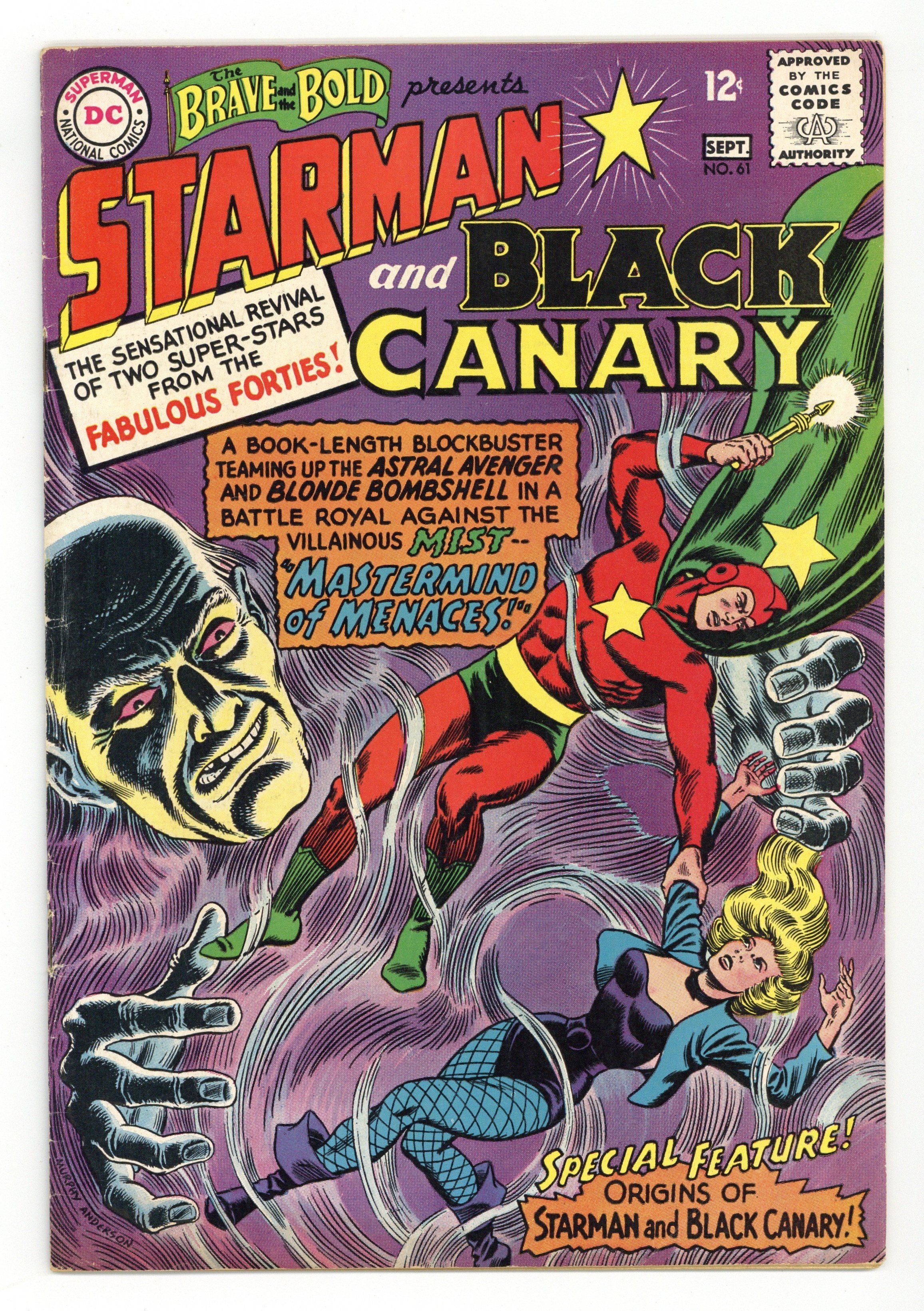Starts Dec 15 Cover by Murphy Anderson. "Mastermind of Menaces," script by Gardner Fox, art by Murphy Anderson; The villainous Mist returns to his life of crime by using flowers from Dinah Drake's floral shop to hypnotically induce wealthy people into parting with large sums of money, and when Starman gets involved in the case, the Mist figures out a way to nullify his famed Gravity Rod. The Origin of Starman article by Julius Schwartz, art by Jack Burnley. The Origin of Black Canary article by Julius Schwartz, art by Carmine Infantino. 36 Pages, Full Color. Cover price $0.12.