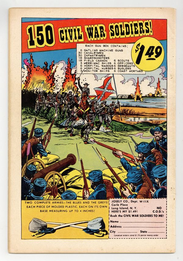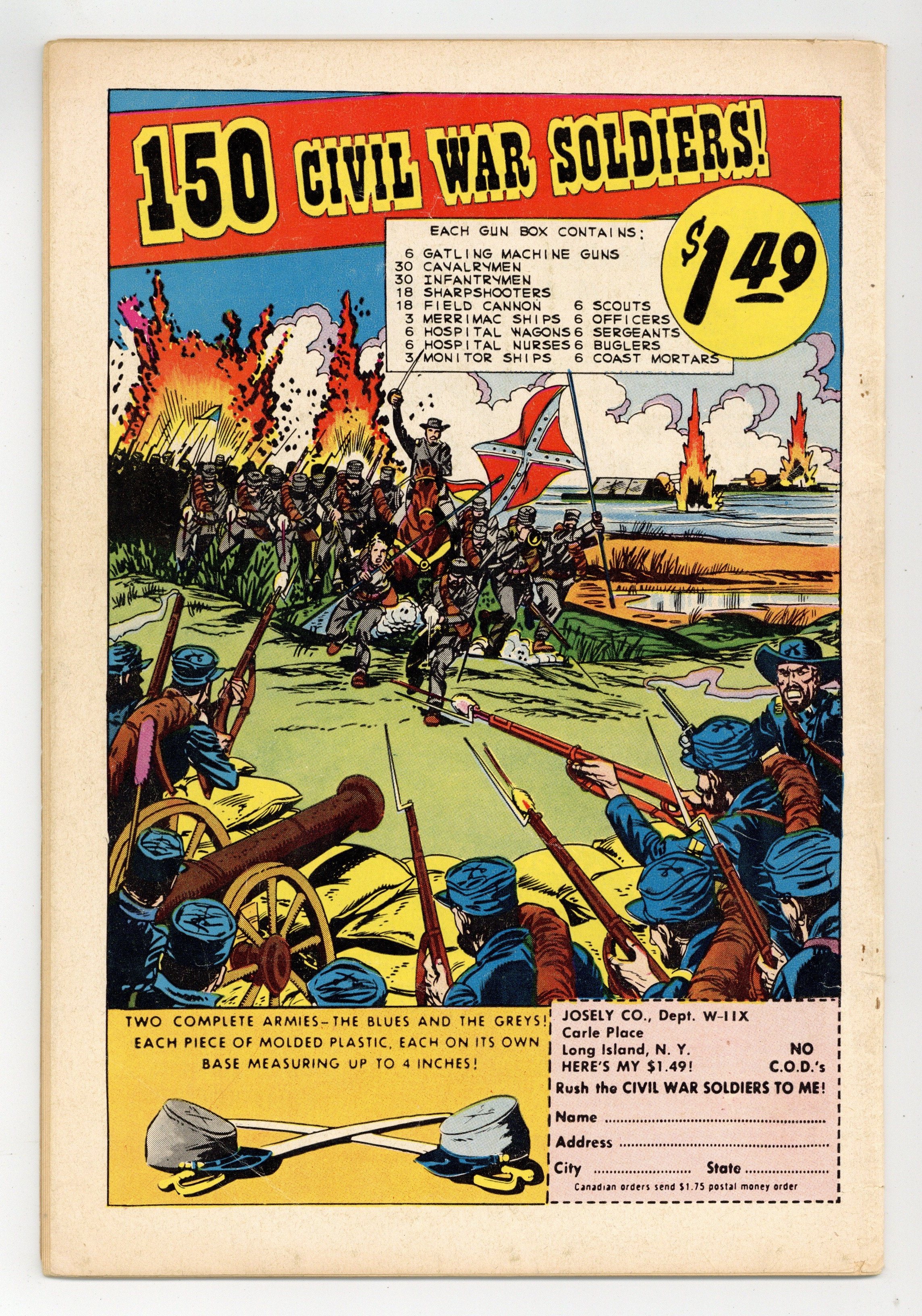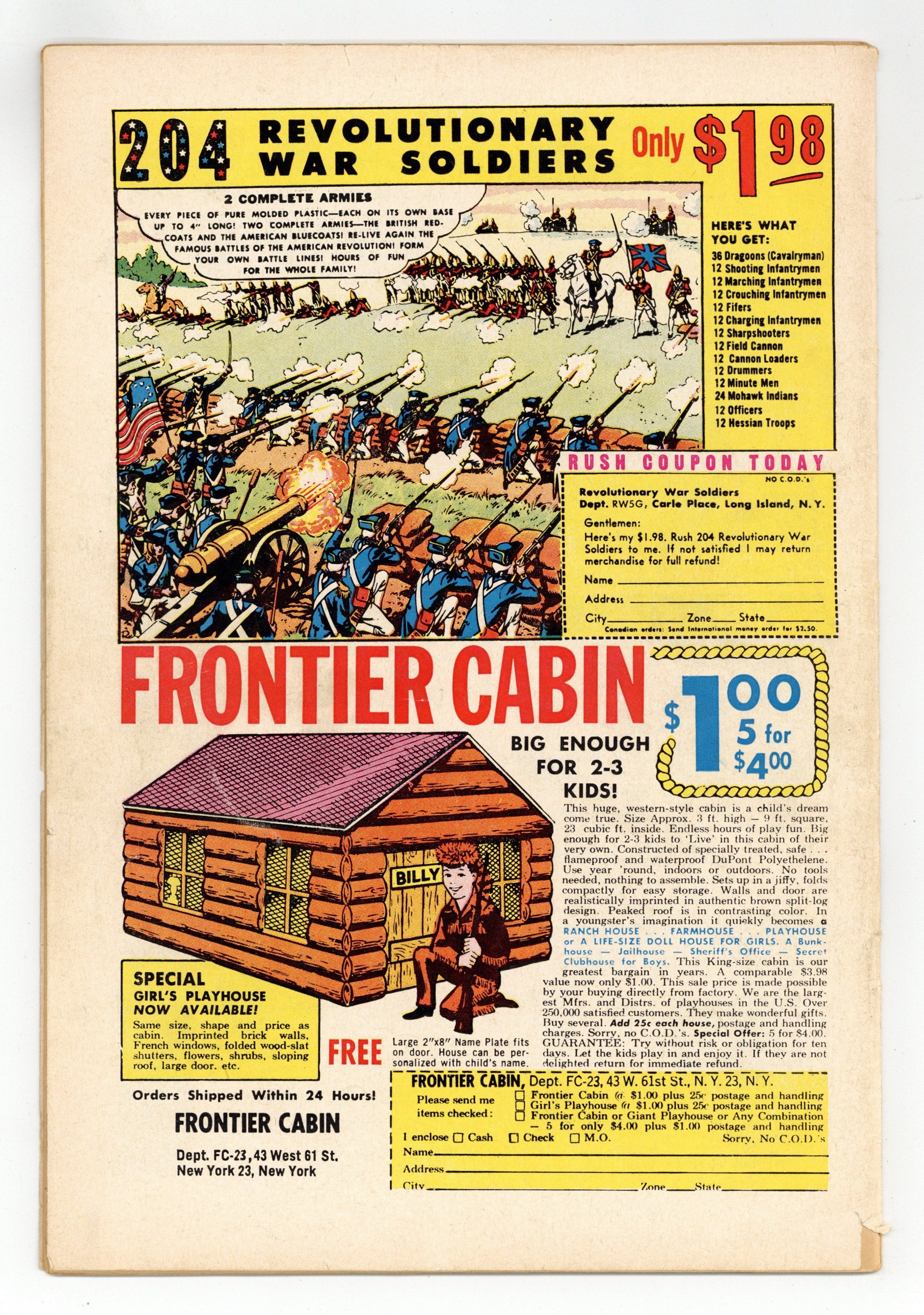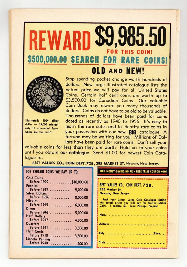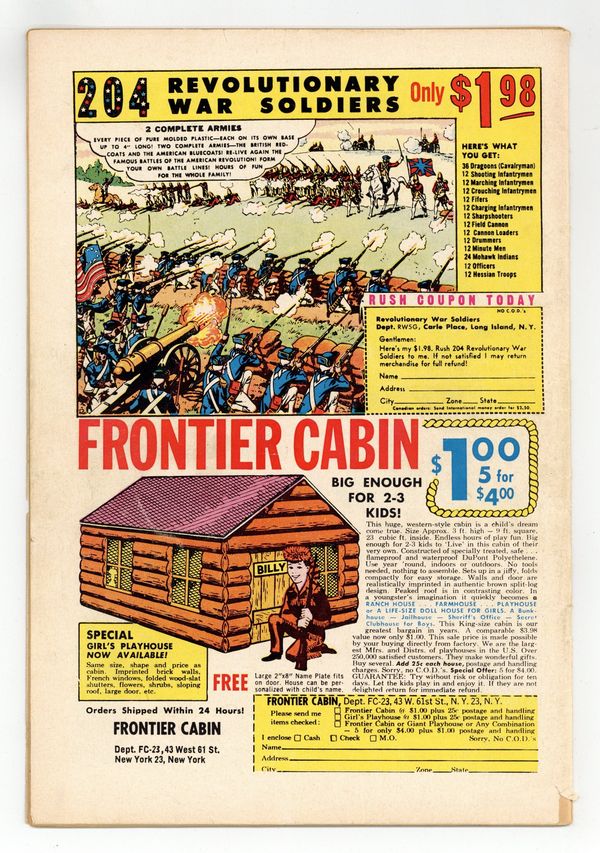 Ends Dec 8 8:43 PM CST Bid History 4 bids Current Bid $34 Your Secret Max Bid If you'd like to bid, please log in or register. Cover pencils by Mike Sekowsky, inks by Murphy Anderson (center panel) and Bernard Sachs (vignettes). Crisis on Earth-A!, script by Gardner Fox, pencils by Mike Sekowsky, inks by Bernard Sachs; The JSA defeats the Lawless League and then the three monstrous creatures created by the Johnny Thunder of Earth-1; He concedes defeat and tells the Thunderbolt to turn back time to before he ever heard of him; T-Bolt then later stops Johnny when he's about to wonder if he has a counterpart on Earth-1 again, since all previous events were erased from everyone's minds. Star Names! fact page by Julius Schwartz. Nature's Bill of Rights public service announcement, script by Jack Schiff, art by Sheldon Moldoff. Rocky and Bullwinkle star in a one-page Cheerios ad. Cover price $0.12.
