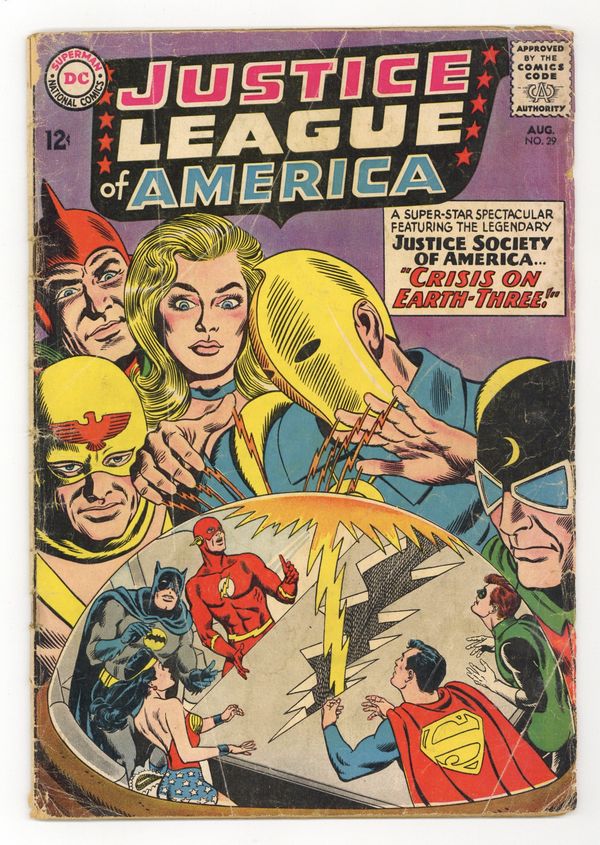 Ends Dec 8 8:43 PM CST Bid History 2 bids Current Bid $6 Your Secret Max Bid If you'd like to bid, please log in or register. Cover pencils by Mike Sekowsky, inks by Murphy Anderson. Crisis on Earth-Three, script by Gardner Fox, pencils by Mike Sekowsky, inks by Bernard Sachs; The Crime Syndicate is so bored of life on their Earth as supreme villains, designated as Earth-3, that they come to the JLA's Earth for a new challenge after Ultraman accidentally discovers it when exposed to Green Kryptonite (which gives him a new power with every exposure to it); Just as it looks like the JLA has the upper hand, the Crime Syndicate teleports them to Earth-3, where they have the advantage; To secure a level battlefield the Crime Syndicate plans to go to the Earth-2 and eliminate the JSA. 1st Silver Age appearance of Star Man; Justice Society cross-over. Rocky and Bullwinkle star in a one-page Cheerios ad. 36 pgs. $0.12. Cover price $0.12.