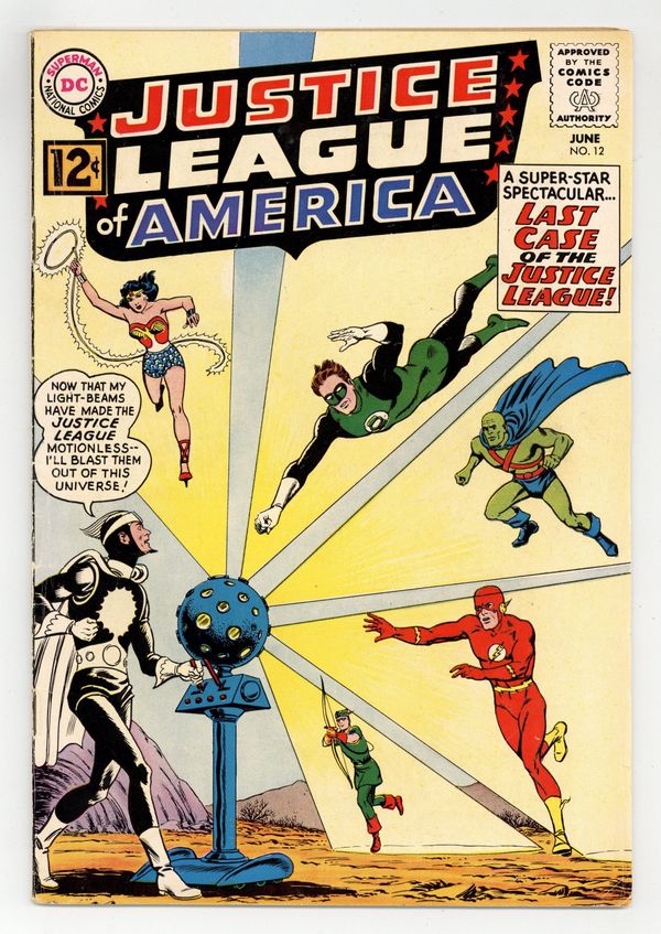 Starts Dec 22 Origin and 1st appearance of Dr. Light. Cover art by Murphy Anderson. The Last Case of the Justice League!, script by Gardner Fox, pencils by Mike Sekowsky, inks by Bernard Sachs; Snapper Carr is summoned to the Justice League Sanctuary, only to find Dr. Light there; Light tells Snapper that he transported the rest of the Justice League to a surreal universe from which they can't escape. Once he's finished his tale, he freezes Snapper solid; But of course the Justice League saves the day. 36 pgs. $0.12. Cover price $0.12.